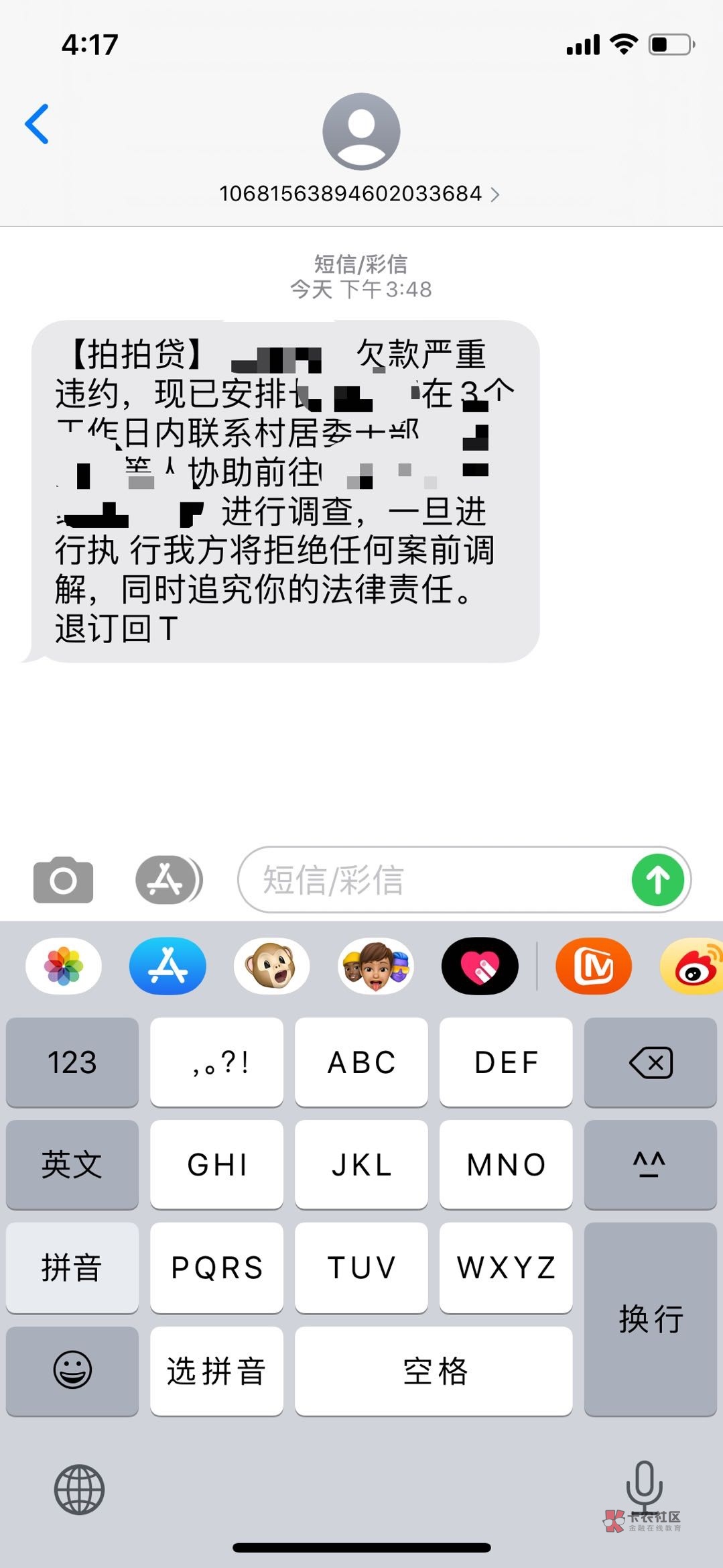 我也两年多了,老手机不用了不知道有没有短信,催收函给我寄过两张没理他