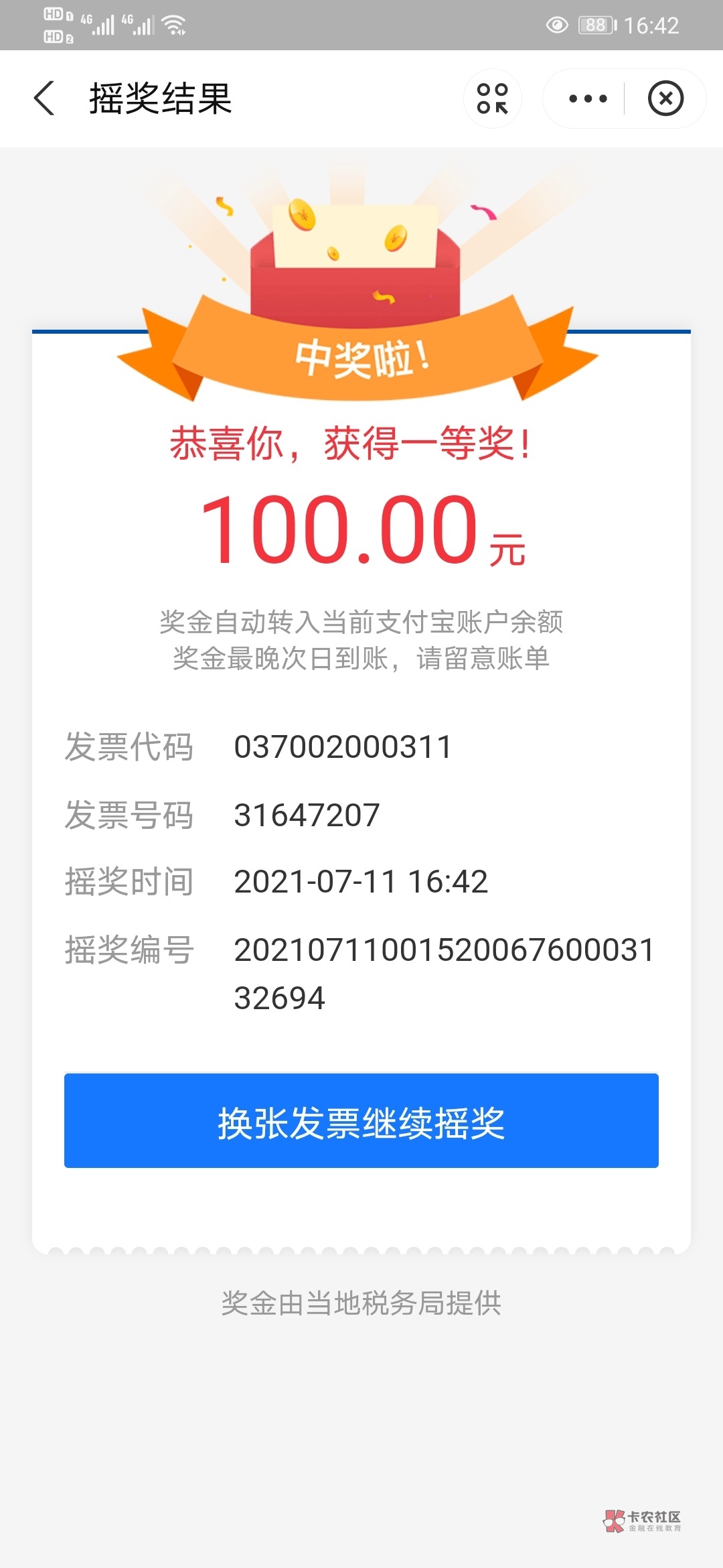 我买了40张,中了两次100,一共两百六,还被支付宝秒扣了100