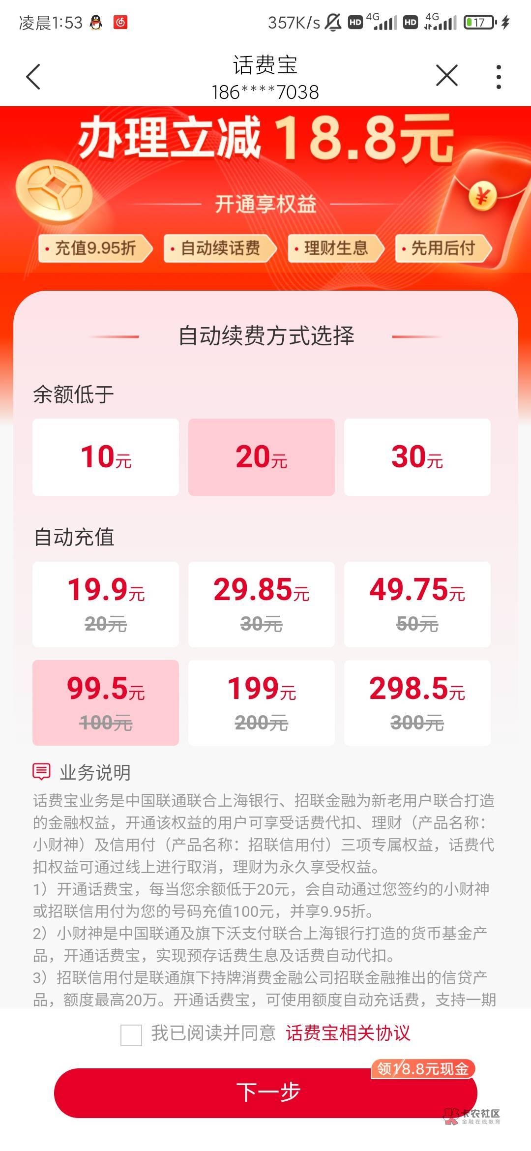 我也收到推送了,你开的什么档的充300T立减金跑路联通黑名单我选的低于10自动充20档
