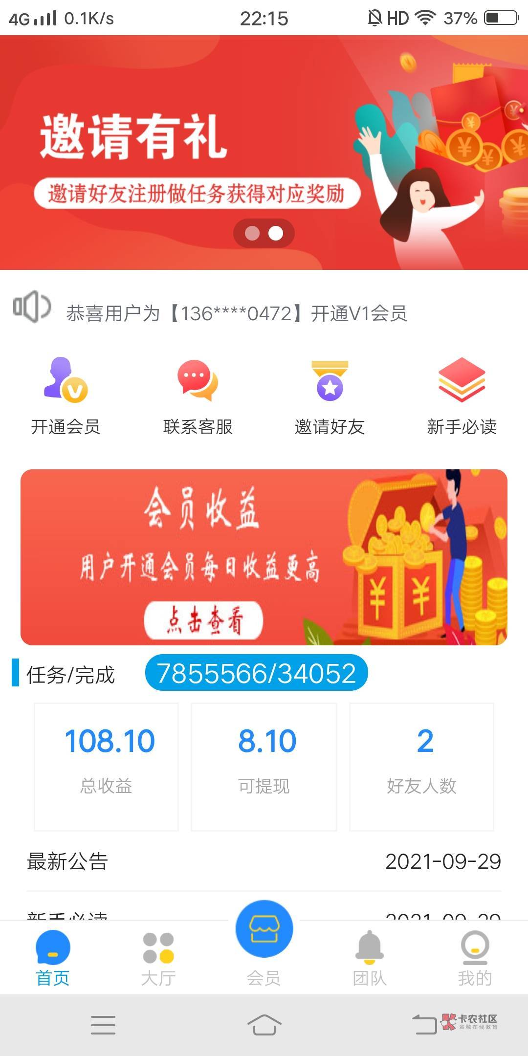 一个做抖音点赞任务的平台,1个任务1.7元,非会员一天3个任务,会员一天20个任务,开通会员需要充值108