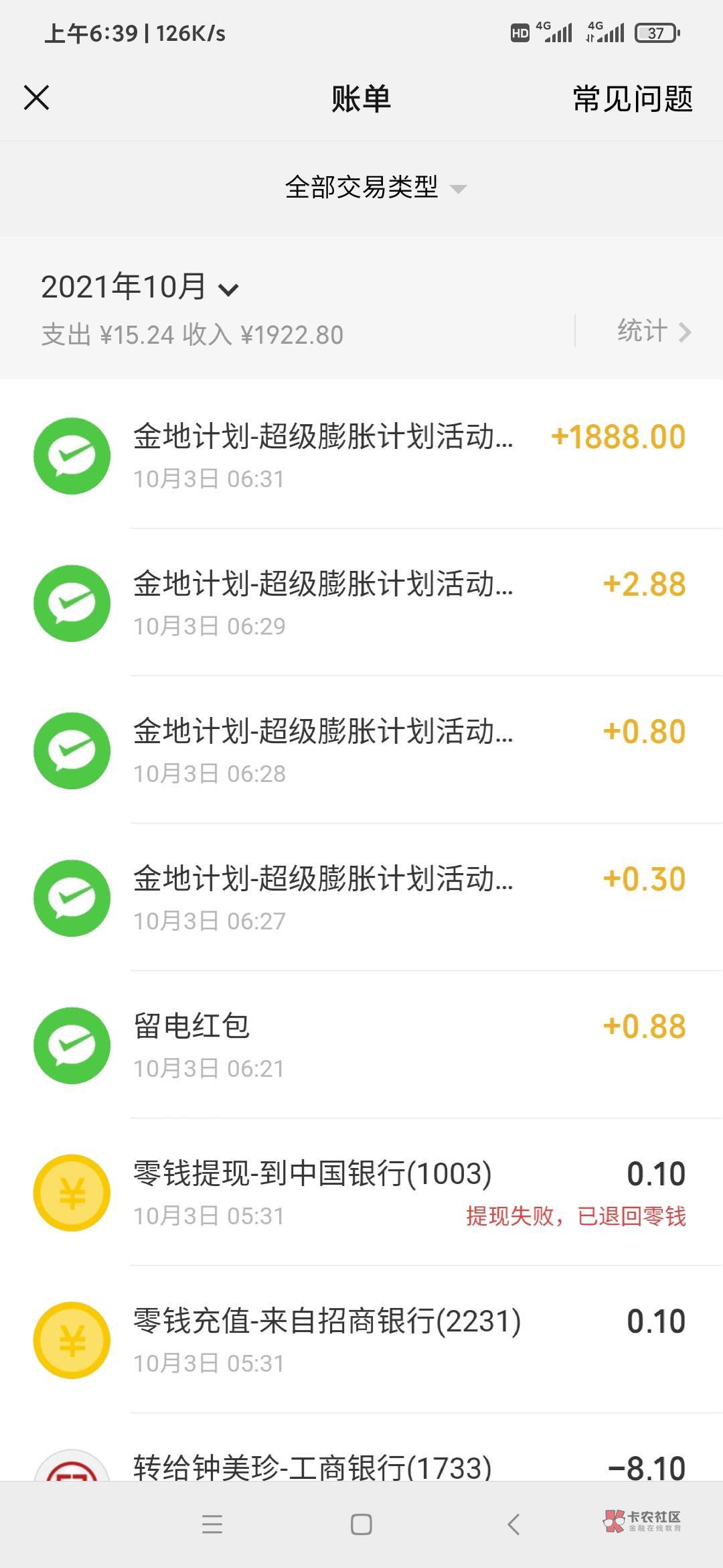 人生真是大起大落 一个小时前1毛钱转来转去的 一个小时后就1888了