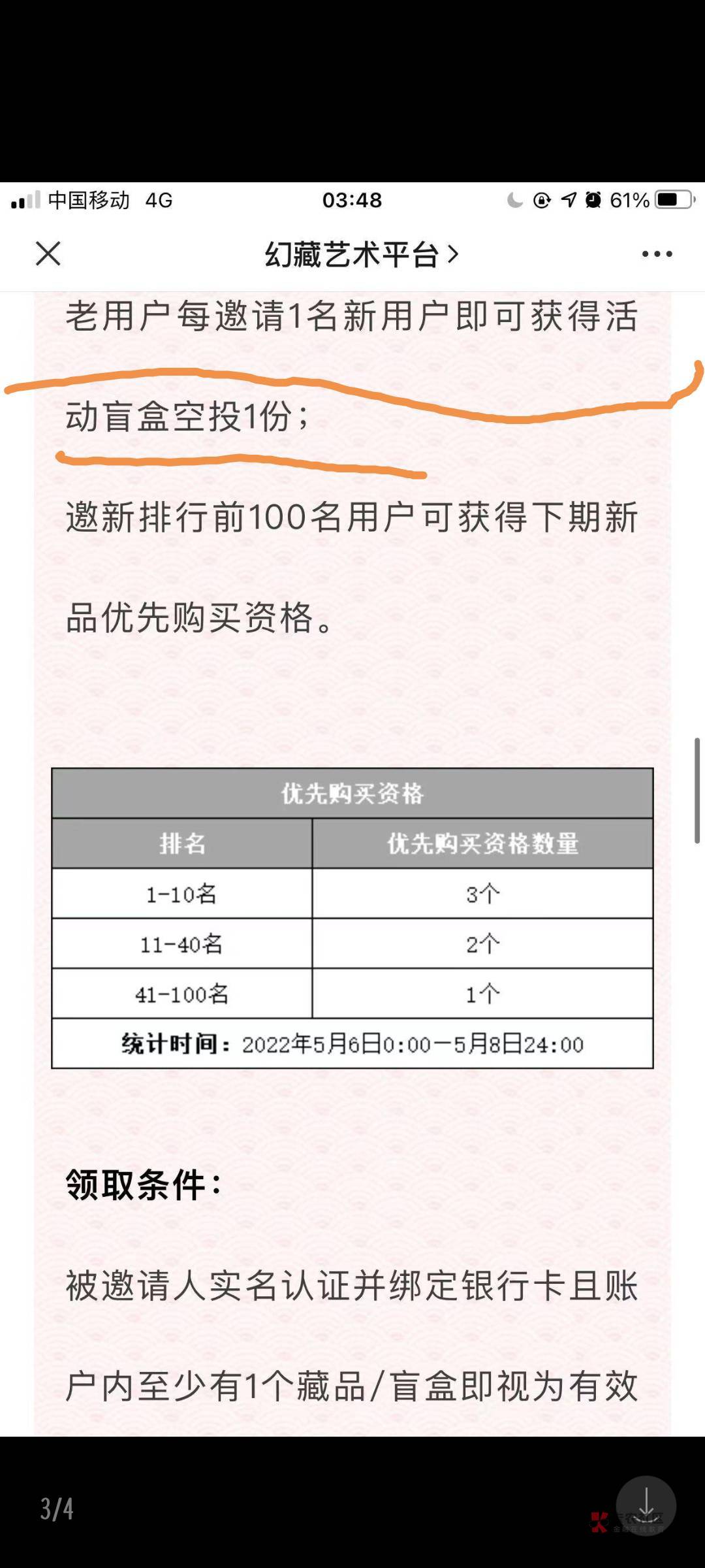 大哥 我不太懂,你说一个空投40左右,有的人干嘛60,70邀请一个人 就像你说的10个头还不确定能不能进100名,就算进了一个优先购能值多少,还有请你看清楚一点,这句话是什么意思