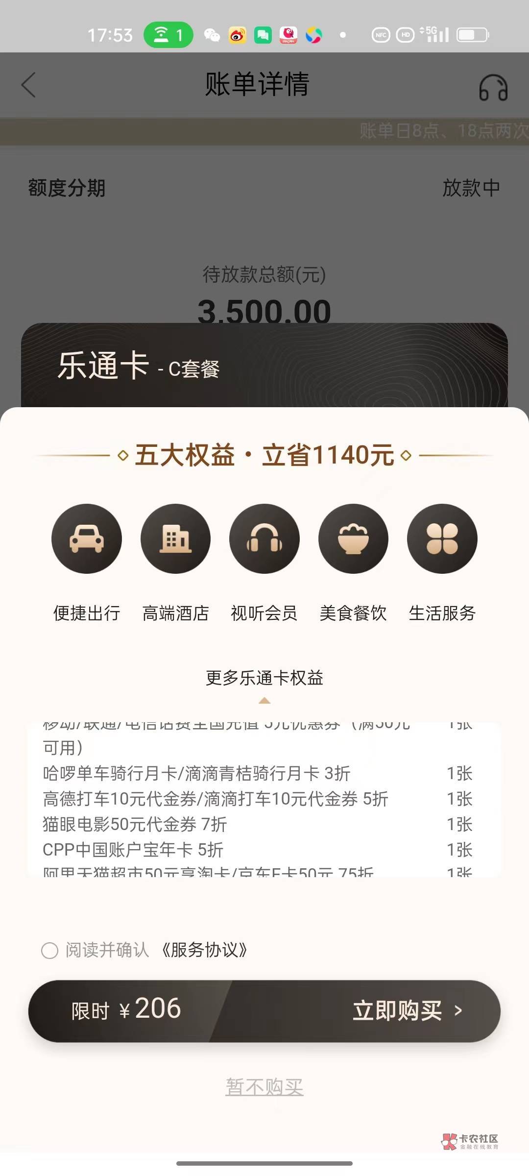 申请了一万,这个卡要500多,怎么敢买,还退不了