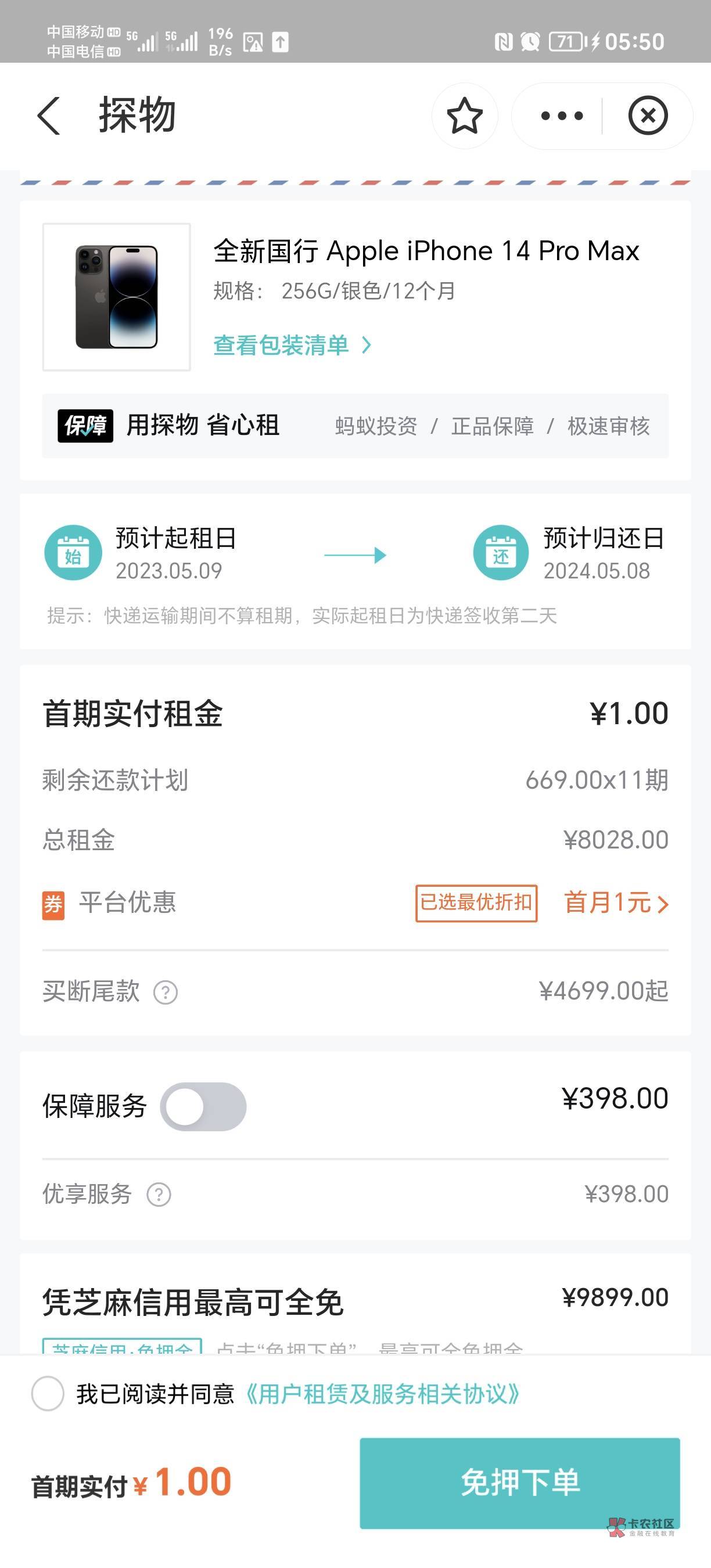 我上个月是友好物,一元首付,打电话问了地址就发货了。。回收8400