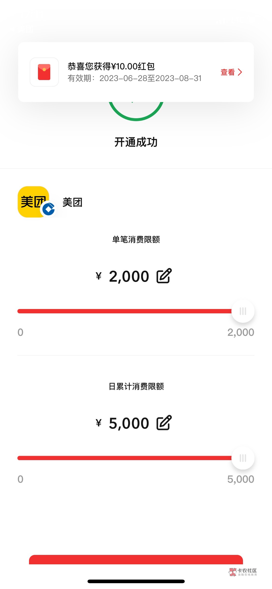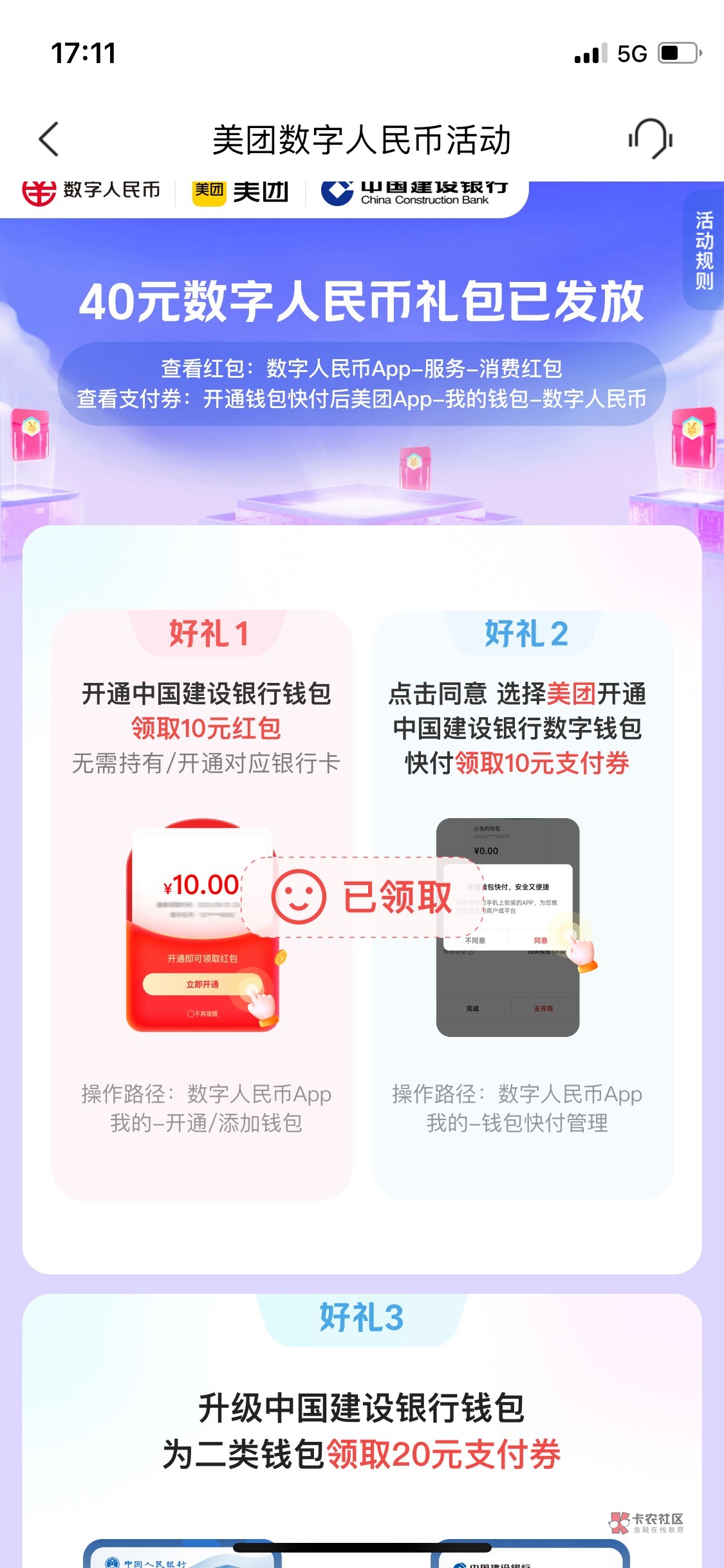 四类的话数币红包10一张限美团,美团App建行数币50-5、20-5各一张;升级二类后App建行数币45-10、30-10各一张,早上申请了