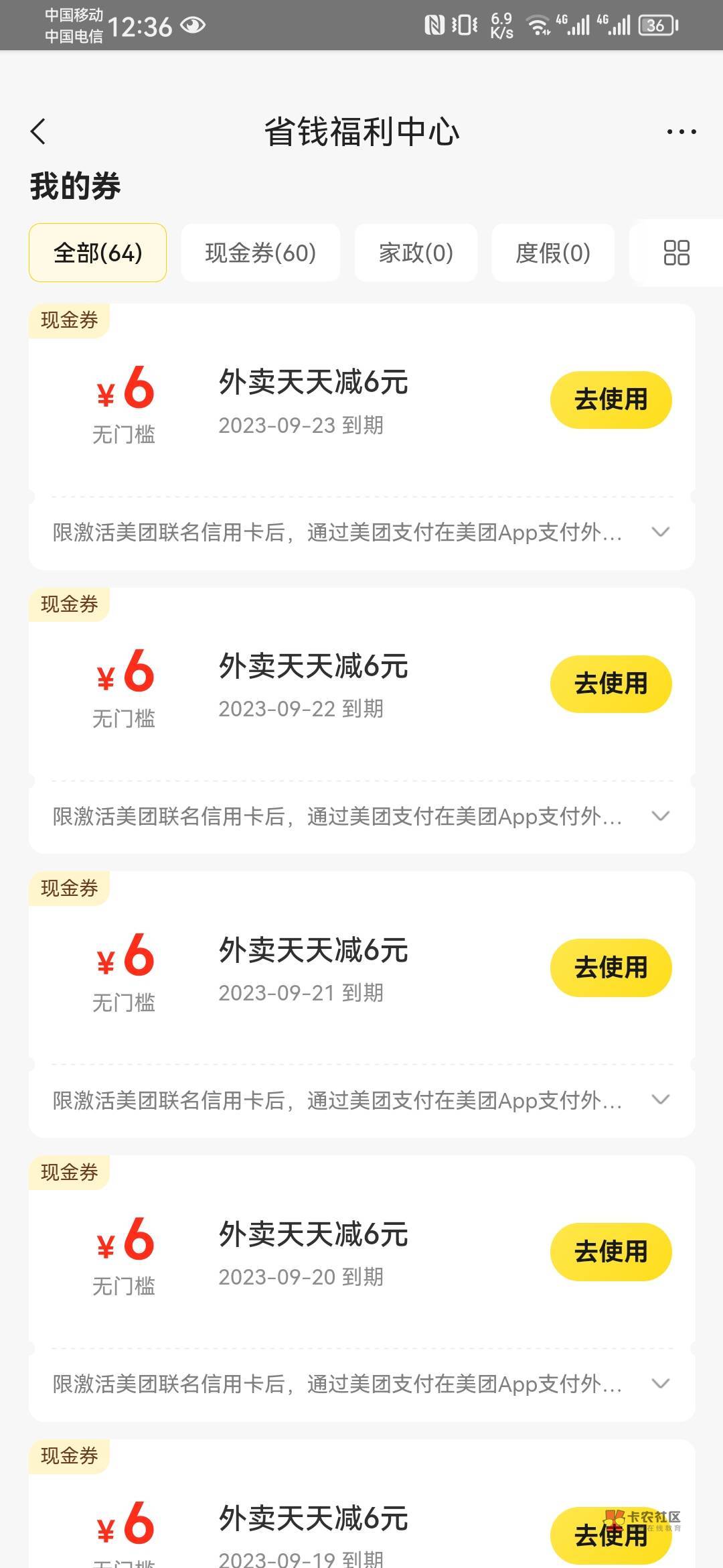 老哥们申请通过的去美团,给了60张无门槛6元红包,