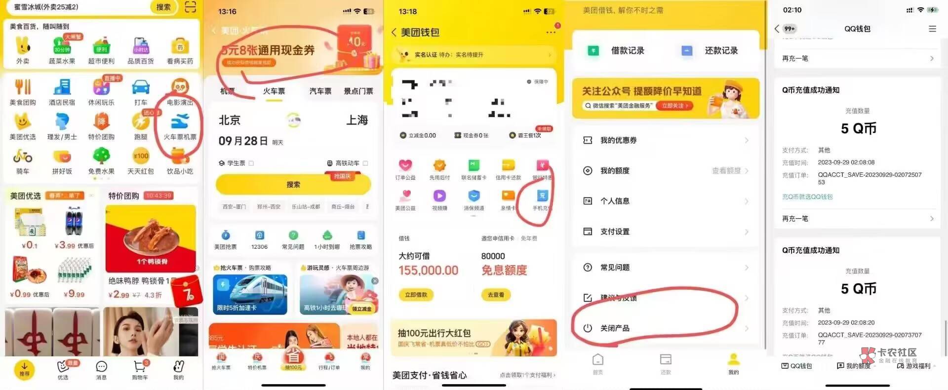 美团app,首页-火车机票-点图二通用现金券横幅,开通授信,返回美团我的~钱包,手机充值,找到冲qb 5qb支付0.01,可以支付8次,40qb到手,然后去第二张图那里,关闭服务即可,没睡的夜猫子速度上,亲测已到账