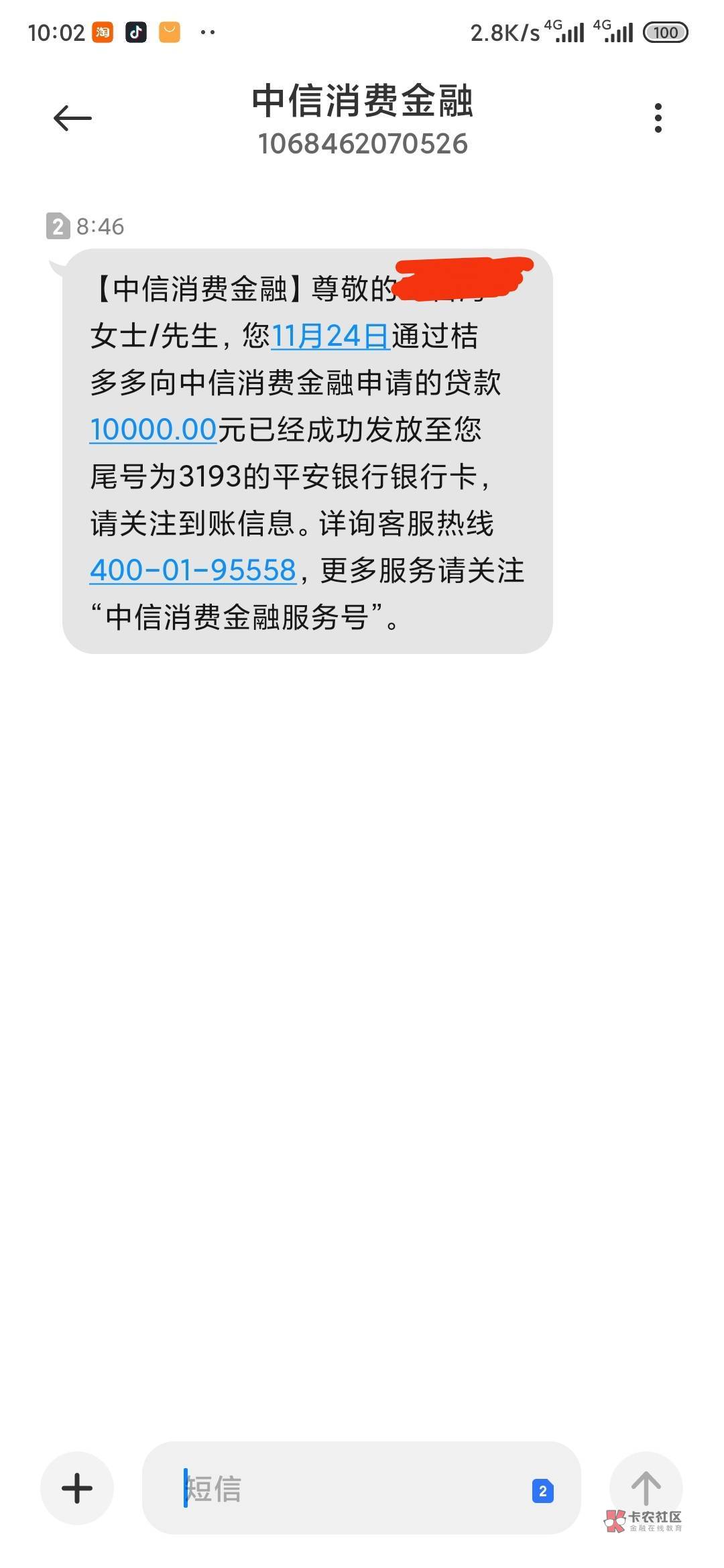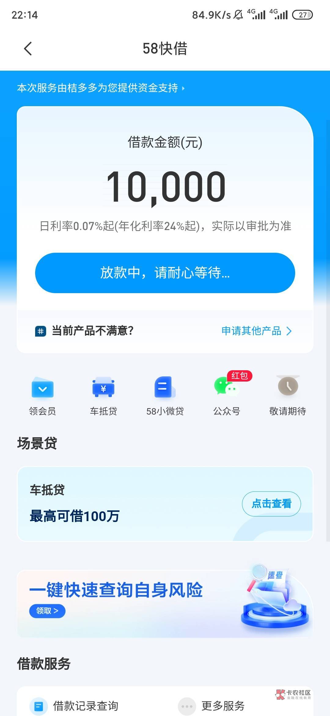 @卡农阿比 好的,老哥们,看你们发58好借,一年没下过款了,我也来试一下,匹配桔多多给1万额度,今天早上到账了