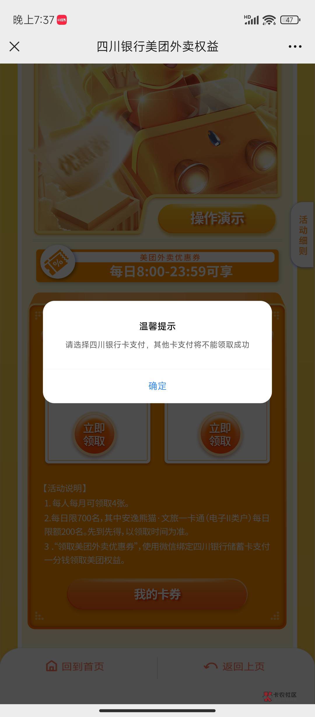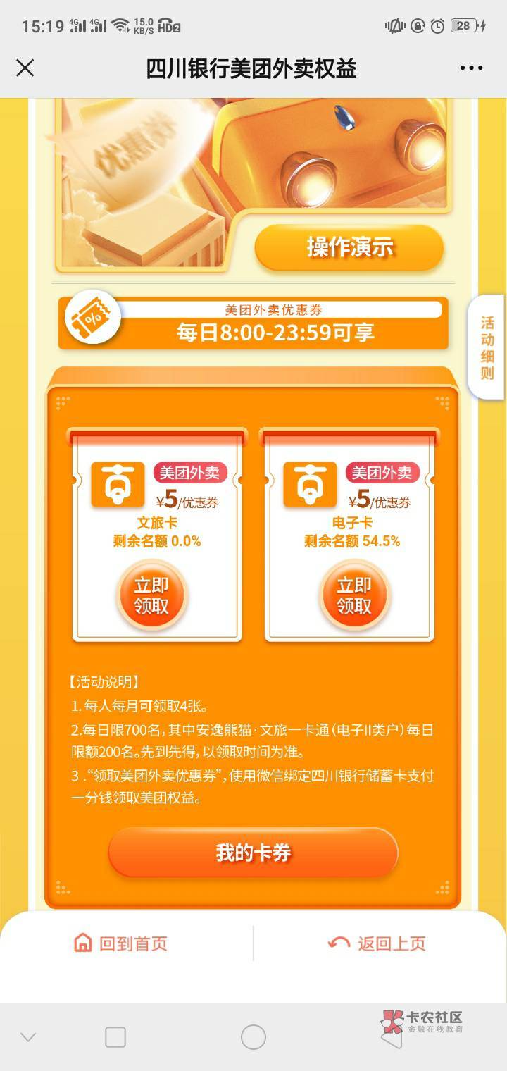 要用四川YHK支付,会抵扣5元,也就是0元买5美团,每天1张,每月4张