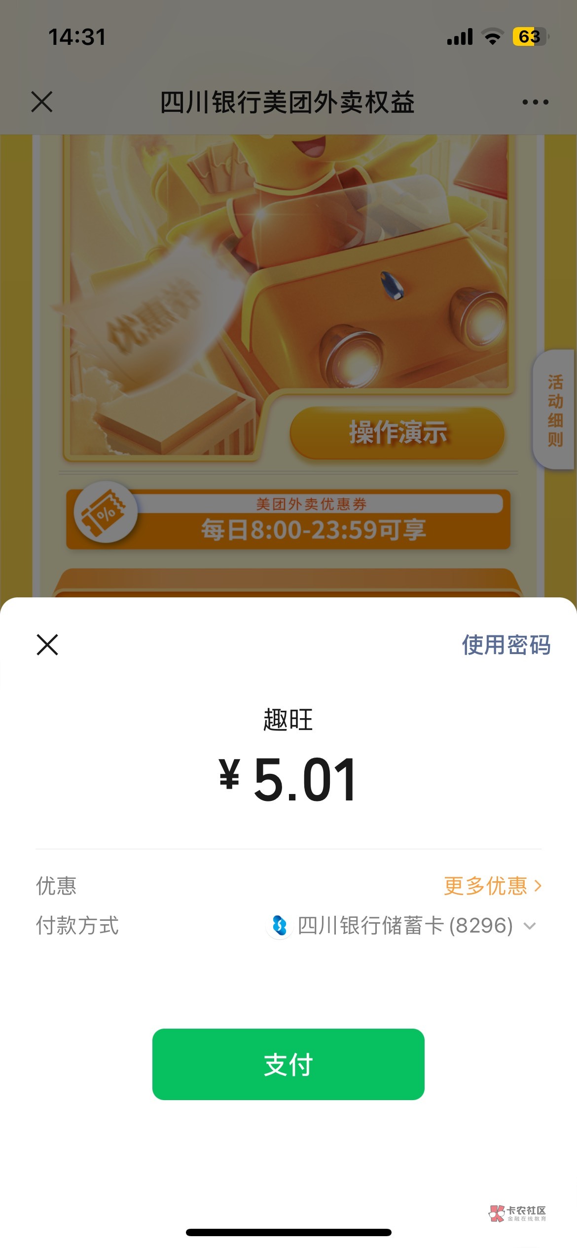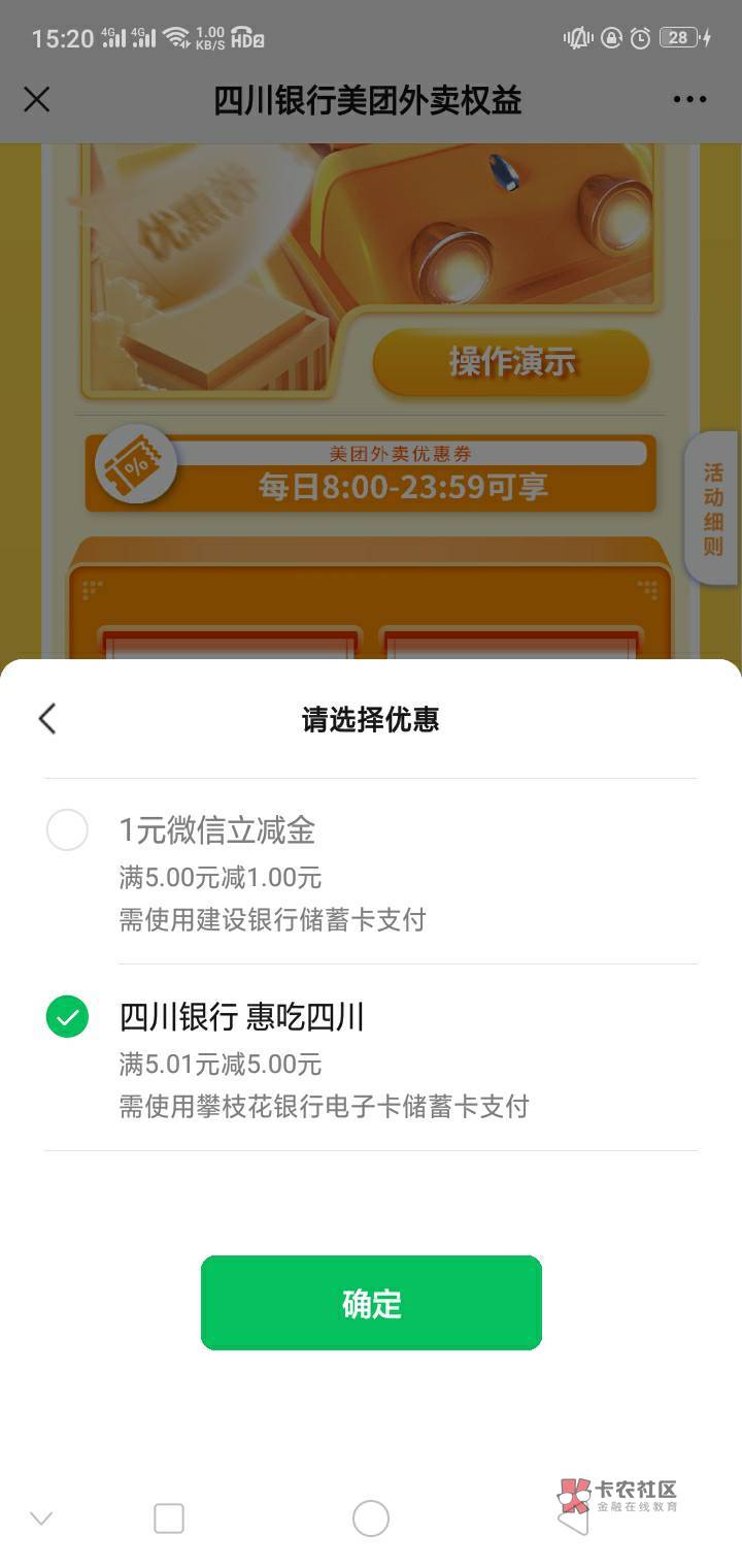 这是四川银行的活动,需要四川YHK支付,支付的时候会抵扣5元,也就是0元买5美团