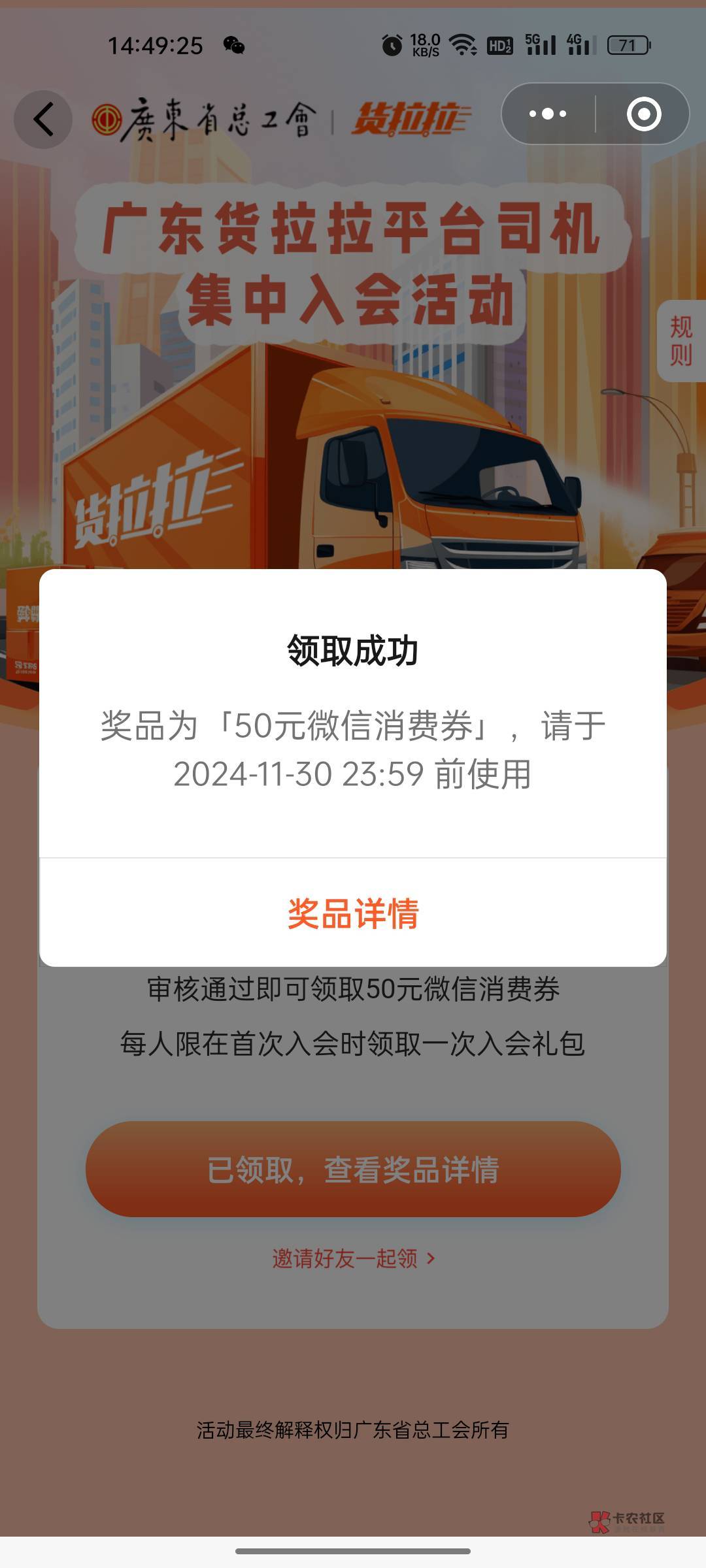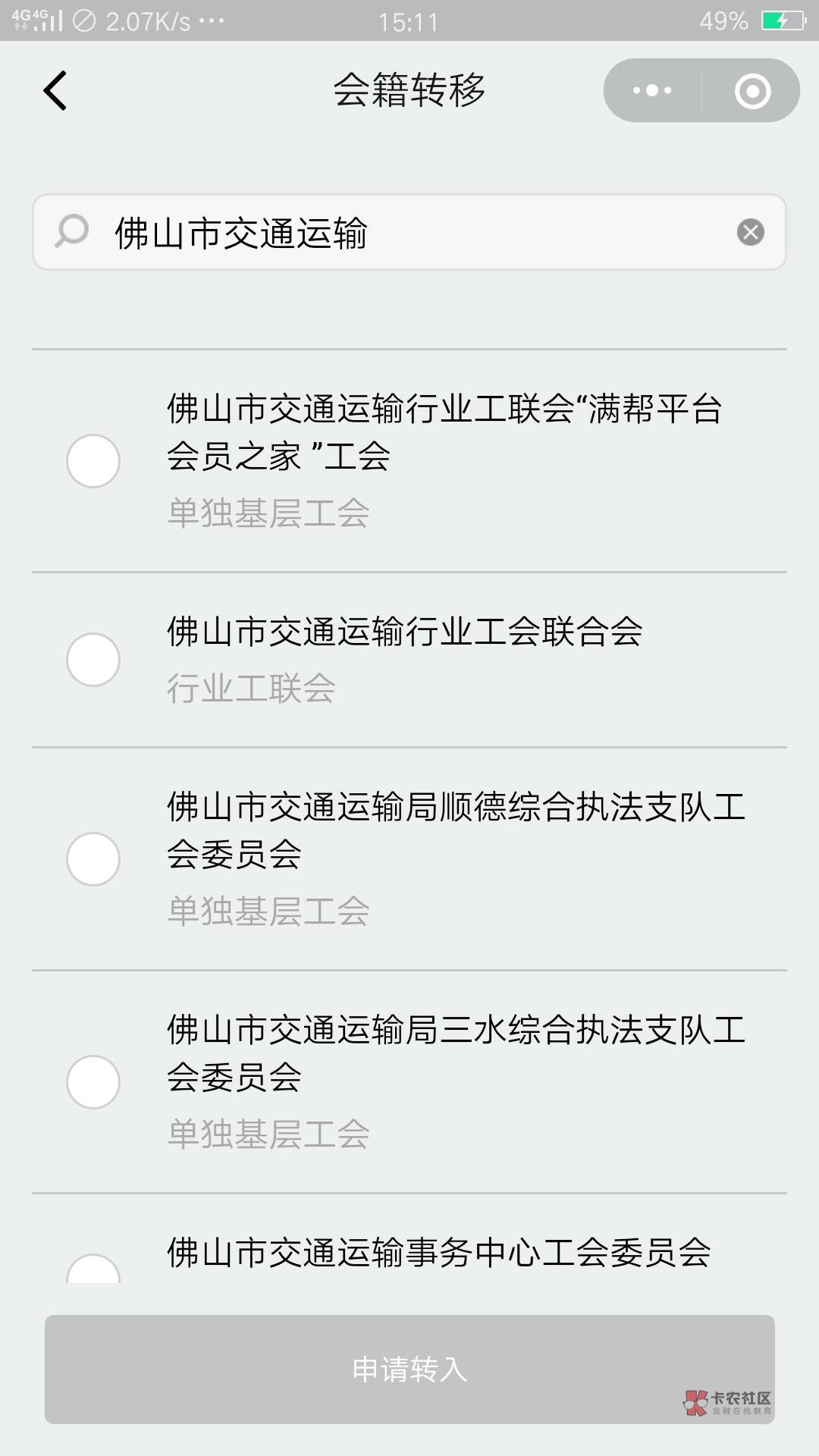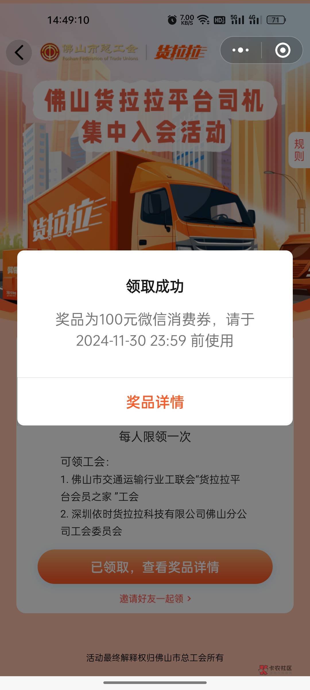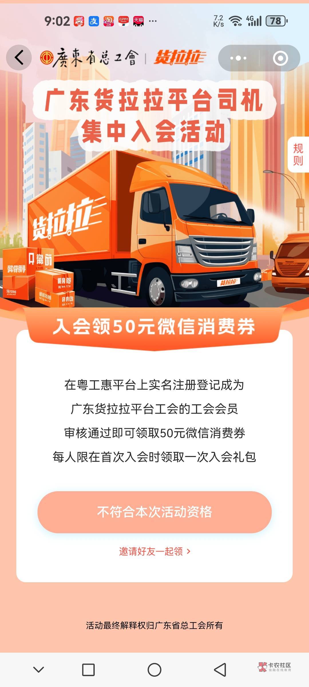 我是从来没领过50的,一直卡在珠海交通,然后粤工会小程序转会到这个电子科技基层,通过了就去新业态小程序,转到佛山货拉拉会员之家那个工会