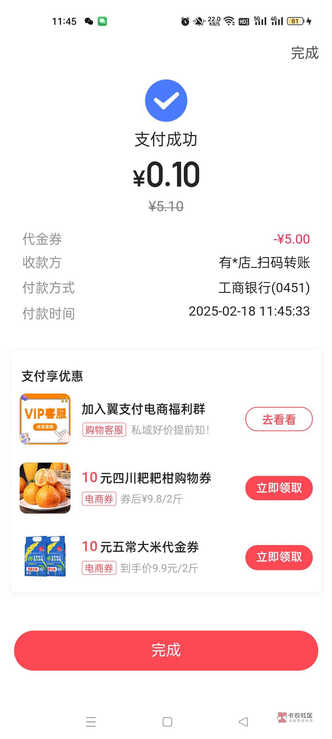 3,然后领取那个5话费的,别领错,然后去翼支付扫自己收款码,黄底的那个不是绿底的,扫码支付注销,换V继续。多V.多弄,一V5。未实名的也可以弄,支付券是在翼支付的。