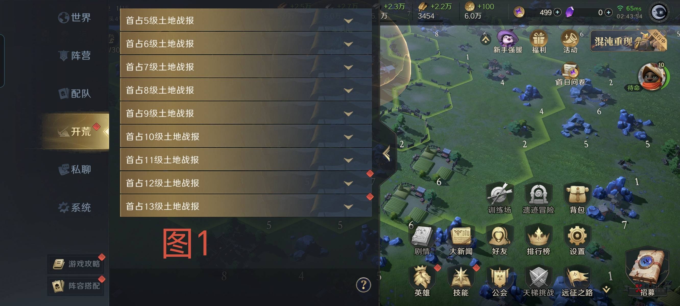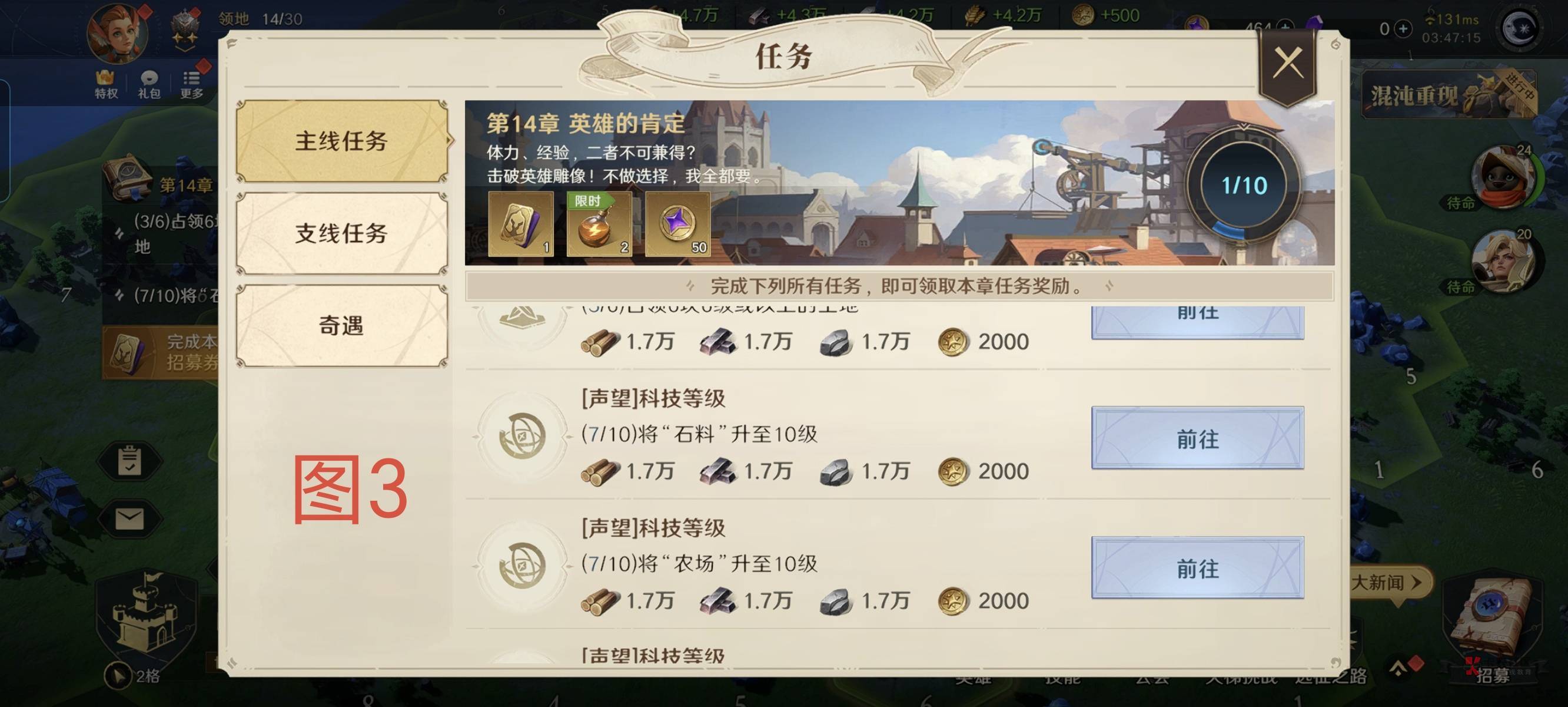 第二,如图3,第十四章那些升级建筑任务通通不做!不做!只做打地任务,做完你大概是人物25级,全技能8或者9。这时候可以开垦基地附近的地,把石材,木材,铁矿都各垦一块成7级。