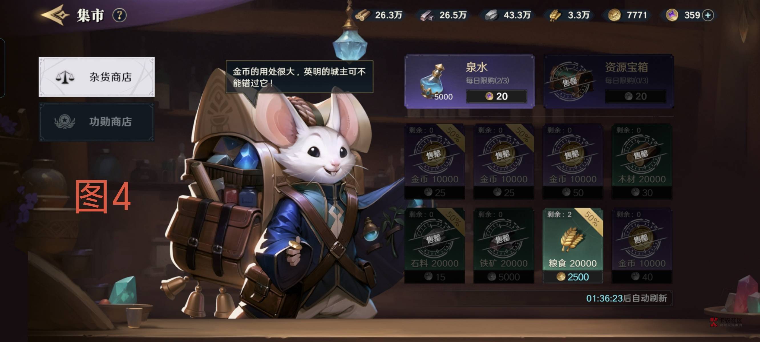 第三,如图4,商店里的东西除了粮食和水,全买了。市集上面有个游历也做一下。关键来了,左上角.卷.字,里面有10+3张券,是用来打雕像的,如图5。切记不要贪心,打6级就好,因为打不过他也扣一张!打一次可以得到一个箱子,在道具里面打开可以选材料。