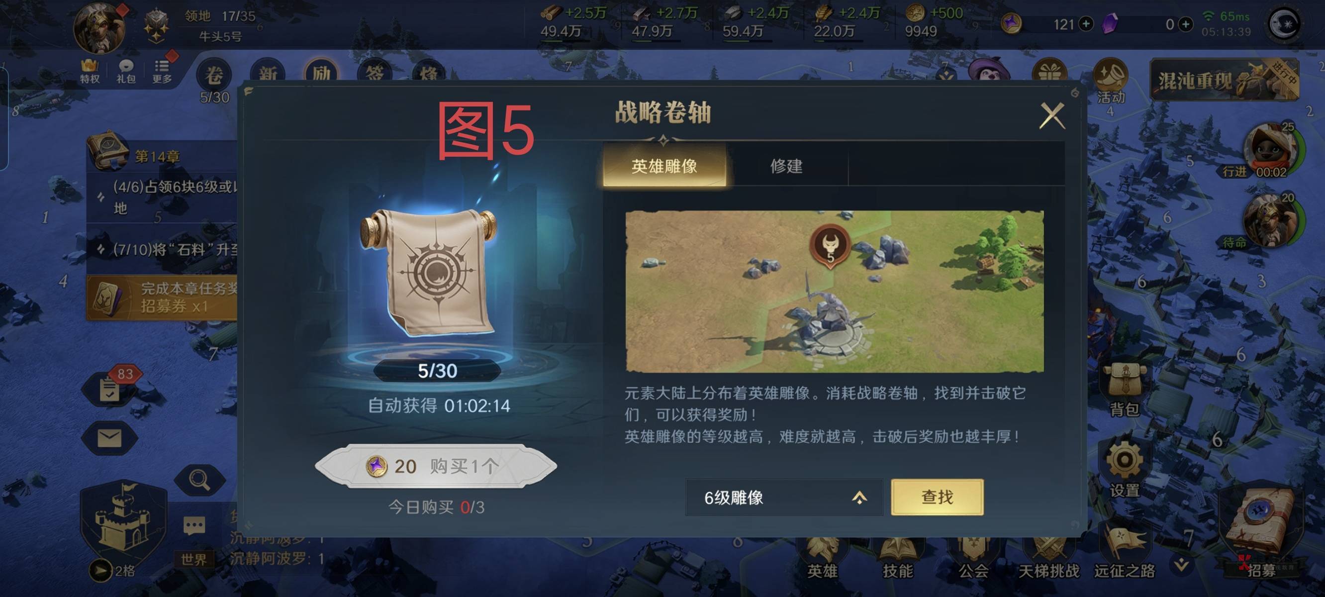 第四,你到达十四章,议事厅6升7需要石材60w,铁50w,木材50w。你打材料顺序参考以下:遗迹冒险-市集买东西-游历点4下-基地的7级地选屯田,一次3w5材料,共4次-打雕塑开箱子,缺什么选什么。