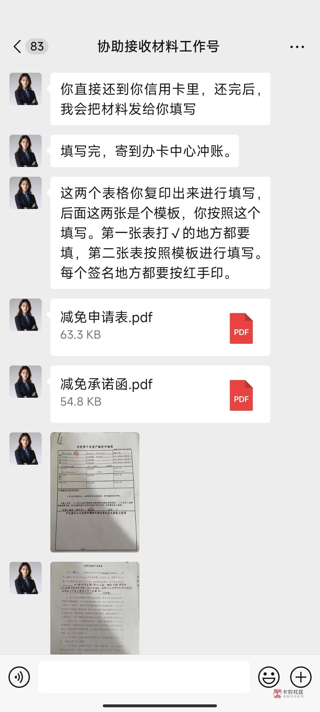 老哥们问个问题,我工商信用卡逾期好久,这月初接到一个电话打过来说可以减免还款,我听完之后觉得可以就同意了约定26号还,23号联系我能不能确定还,确定的话就她那边帮我提交减免申请,我说可以她就帮我提交了,半小时后说通过了,叫我到时还进去,但我没收到银行电话或者短信,问她不用先签还款方案合同啥的吗?对方说不用然后发了两个附件给我说去打印出来,钱还进去后把这签了寄过去信用卡中心冲账就可以了,我不放心就打工商客服问了一下,客服说银行那边没看到我的还款方案,叫我登记了信息帮我核对,过两天回复先不要进行还款。