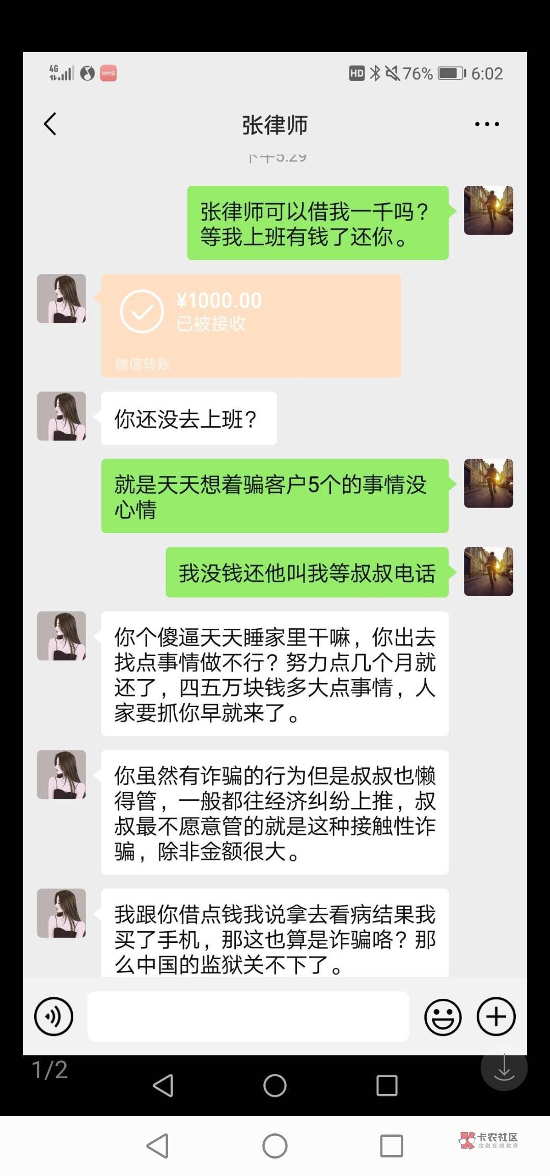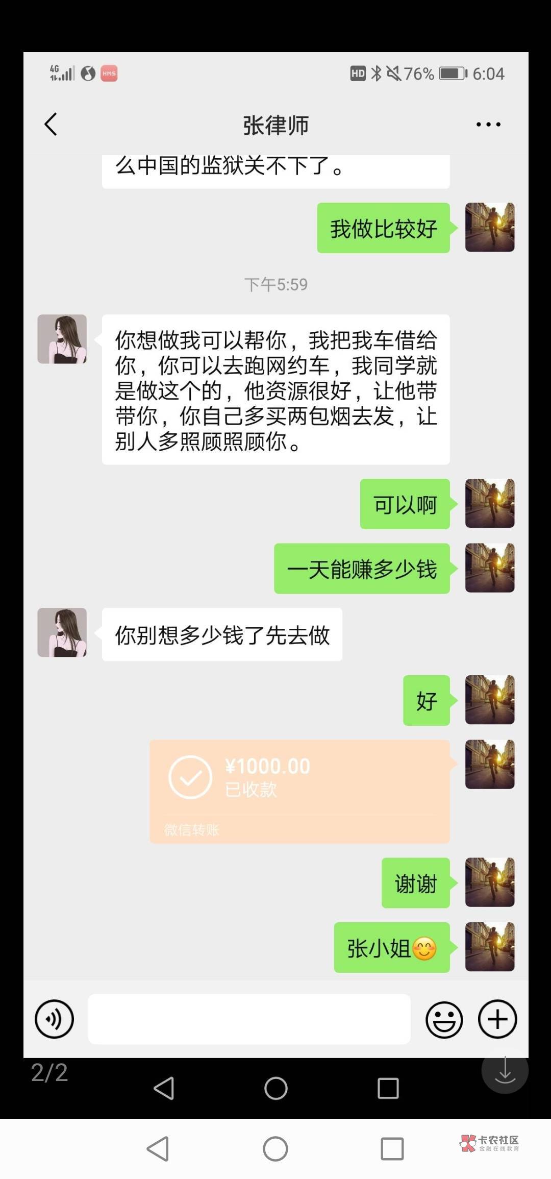 出大事了兄弟们,事情是这样的,一开始我拿了客户5w去站gz,后来我很慌我很怕,我不知道怎么办,就在本地质询了一个律师,如图所示,了解过后我就不怕了,去跟客户坦白了,客户也理解我,让我一年还1w,五年还完,没有利息让我好好做人,后来律师还借了哟1000元让我先度过难关,好好工作赚钱补上客户的钱,我真的谢谢张律师,对我的鼓励,谢谢在我最困难的时候,让我懂得如何振作,犹如再生父母。真的感谢你,后来通过对张律师的了解,我们渐渐有了感情,到现在变成律师我的爱妻老婆了,今天还给了我2w让我去还客户,说月中再给我3w还,明年结婚,不用我一分钱,我的未来老婆张律师给我18w彩礼,县里一T房,车子都转我名下,只要我对她好,他虽然大我25岁,但是我真的很爱她,谢谢他们对我的鼓励帮助让我从地府一下到了天堂,大丈夫能屈能伸方为丈夫。老哥们怎么办,我就是接受不了他还有两个孩子,让我当↑门的我在挣扎我很纠结。