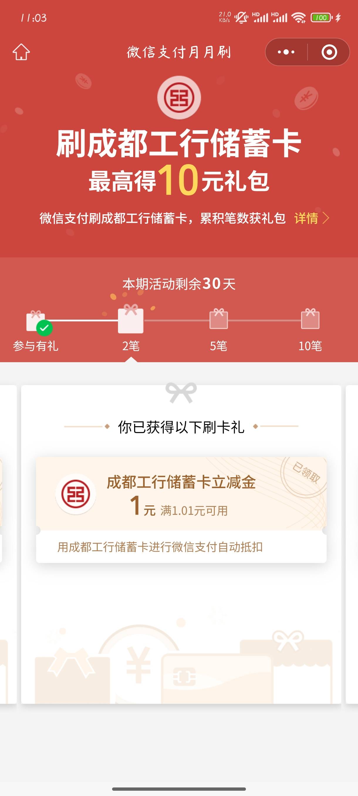 成都工行微信支付月月刷活动