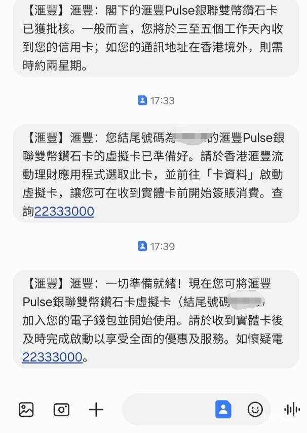 香港汇丰pulse批卡,看到说这个卡可以冲,有返现,就试了一下,7月24日(周四)中午网申了pulse,7月29日(周二)收到了短信,批卡了,选的人民币80%,港币20%,就是额度太低了,已经激活了虚拟卡在用了,实体卡得等邮寄了,问了客服,说是ems邮寄,当时申请时候是拼音(当时还有几个字母打错了)写的地址,今早app上补充了中文地址,但客服说寄卡时不一定赶得上系统里的地址更新(不如咱们大陆的银行更新快),那就只能关注一下ems的单号(问了客服,说汇丰这边是不会告知单号的,那只能通过支付宝里EMS小程序通过关联的手机号自己看了),再致电ems客服沟通派送的正确地址了。