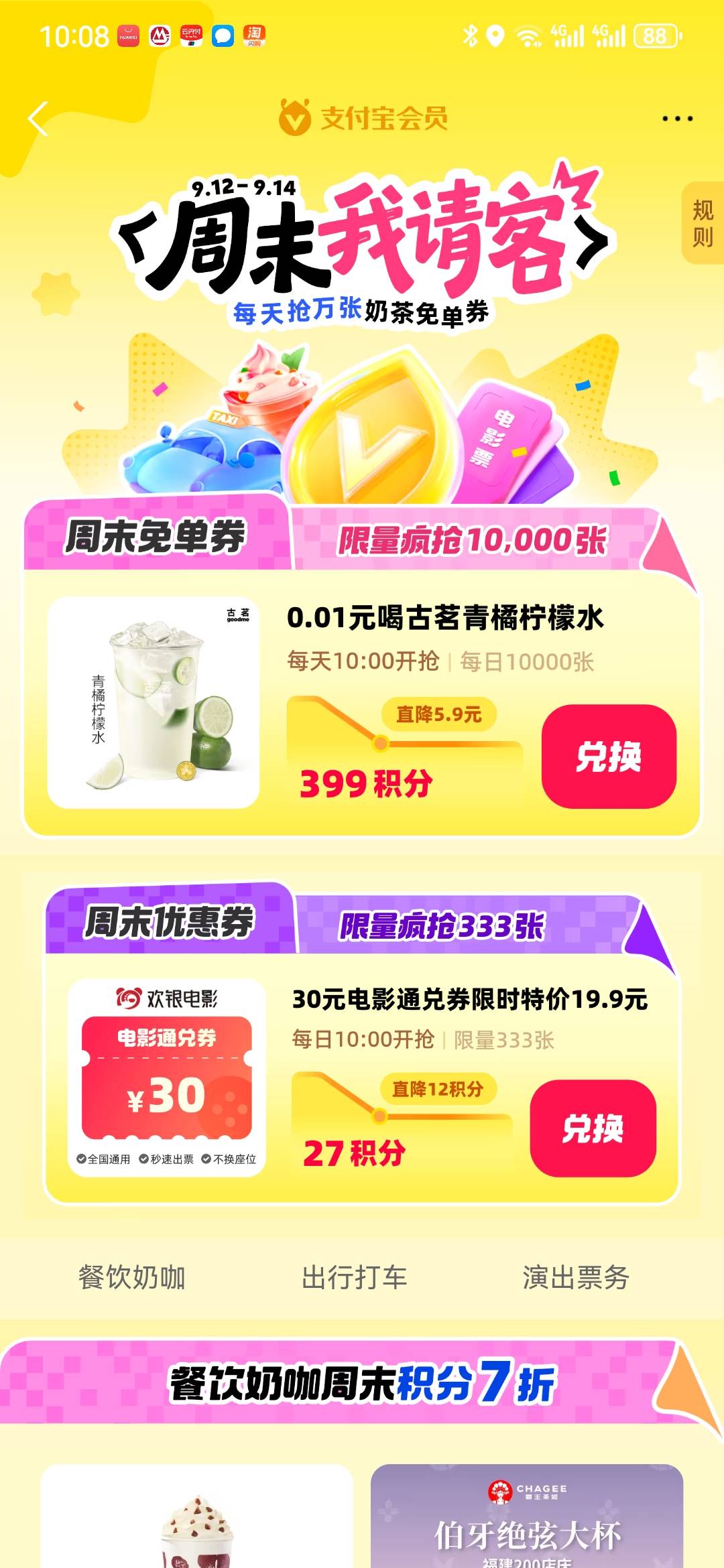 支付宝,会员中心,积分换电影票和柠檬水,需要的去