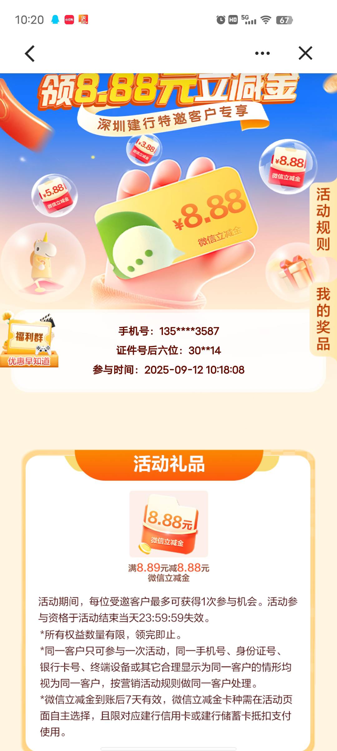 建设银行】支付1分钱,可领8.88元微信立减金,点击查看了解详情s.ccb.cn/SvKKaf。如已参与请忽略。拒收请回复R