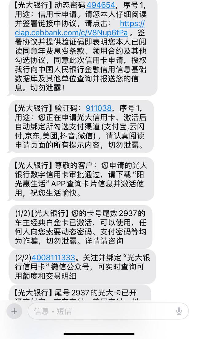 光大银行注销一年多,再下卡,之前网申都是初审通过就没下文了,今天去网点进件,资料弄完隔了几分钟来短信。额度还行吧39k。