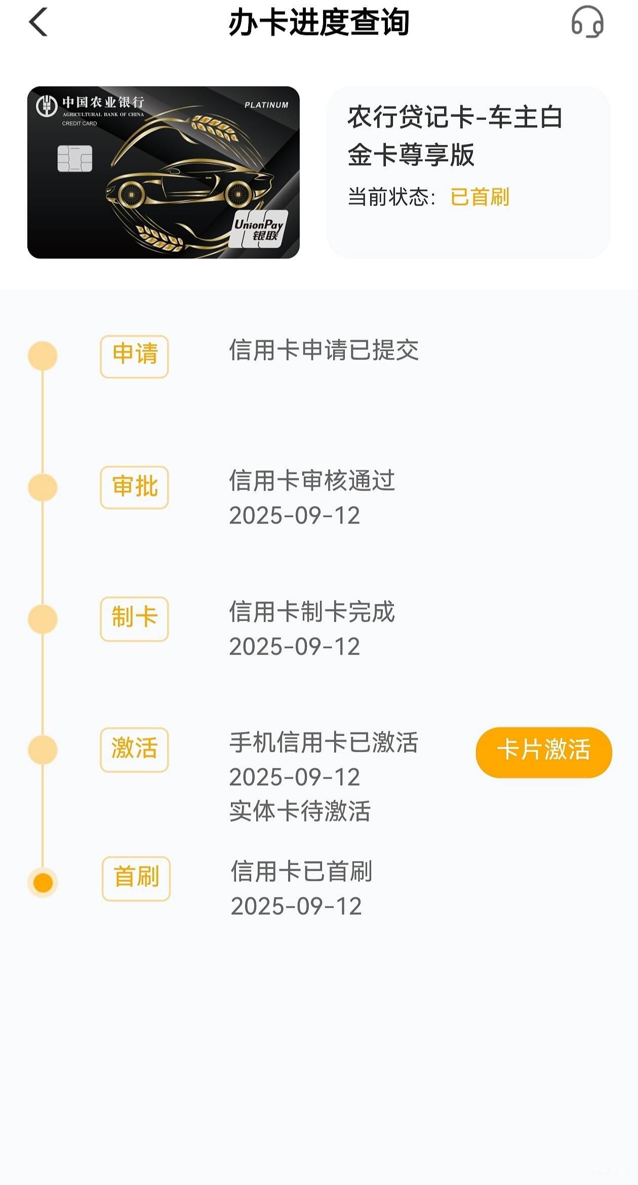 农行车主白尊享版,下午两点直接电脑填表打印签字,半个小时接农行电话核实信息,立马