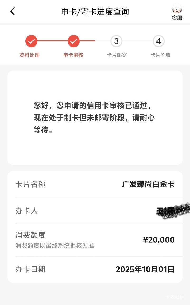 广发银行下卡,额度20000,跟刚申请的中信额度一样。