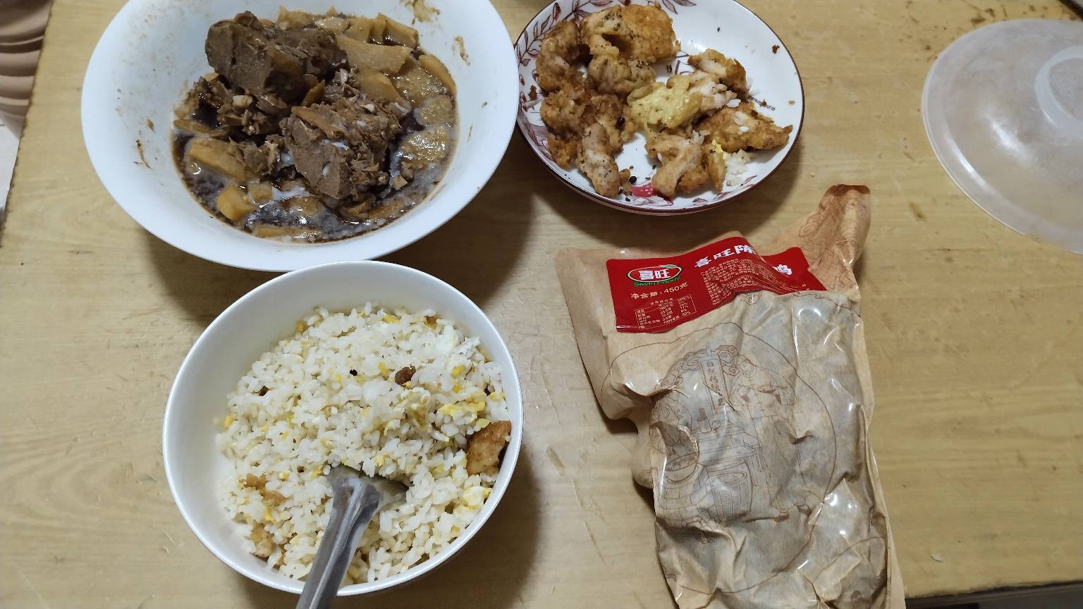 老哥们,准备吃饭然后赶紧睡觉啦一碗蛋炒饭,一份炸鸡肉,一碗土豆炖排骨,一只真空包装的鸡鸡和老酒是前几天日结保安的时候帮业主搬东西业主送的,没花钱