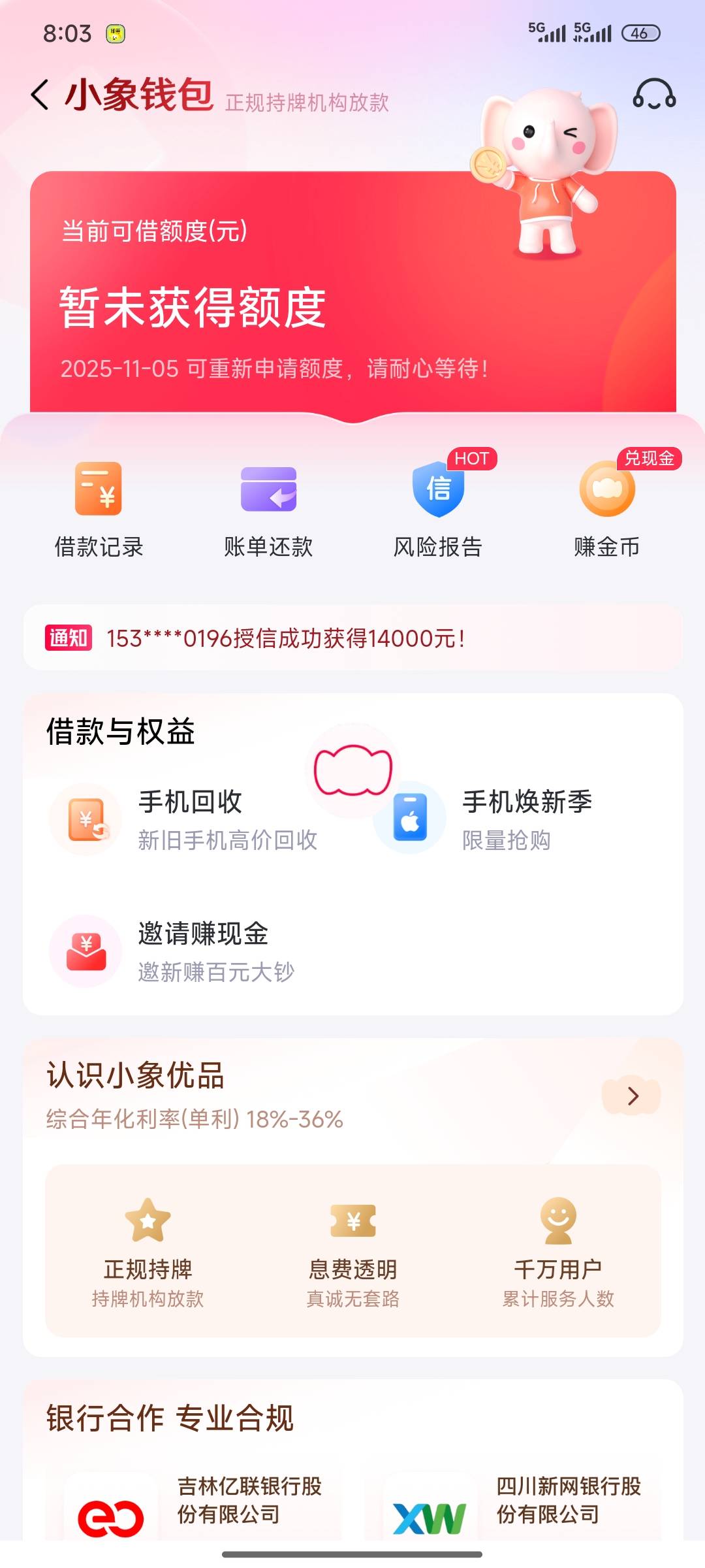 小象钱包下款了,早上九点多提交,下午一点半人工审核,二十分钟左右来短信让认证,十分钟到账。难道有水吗?点啥拒啥,YP都拒,就这个下了。