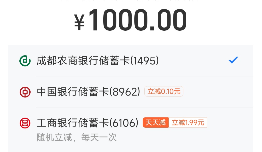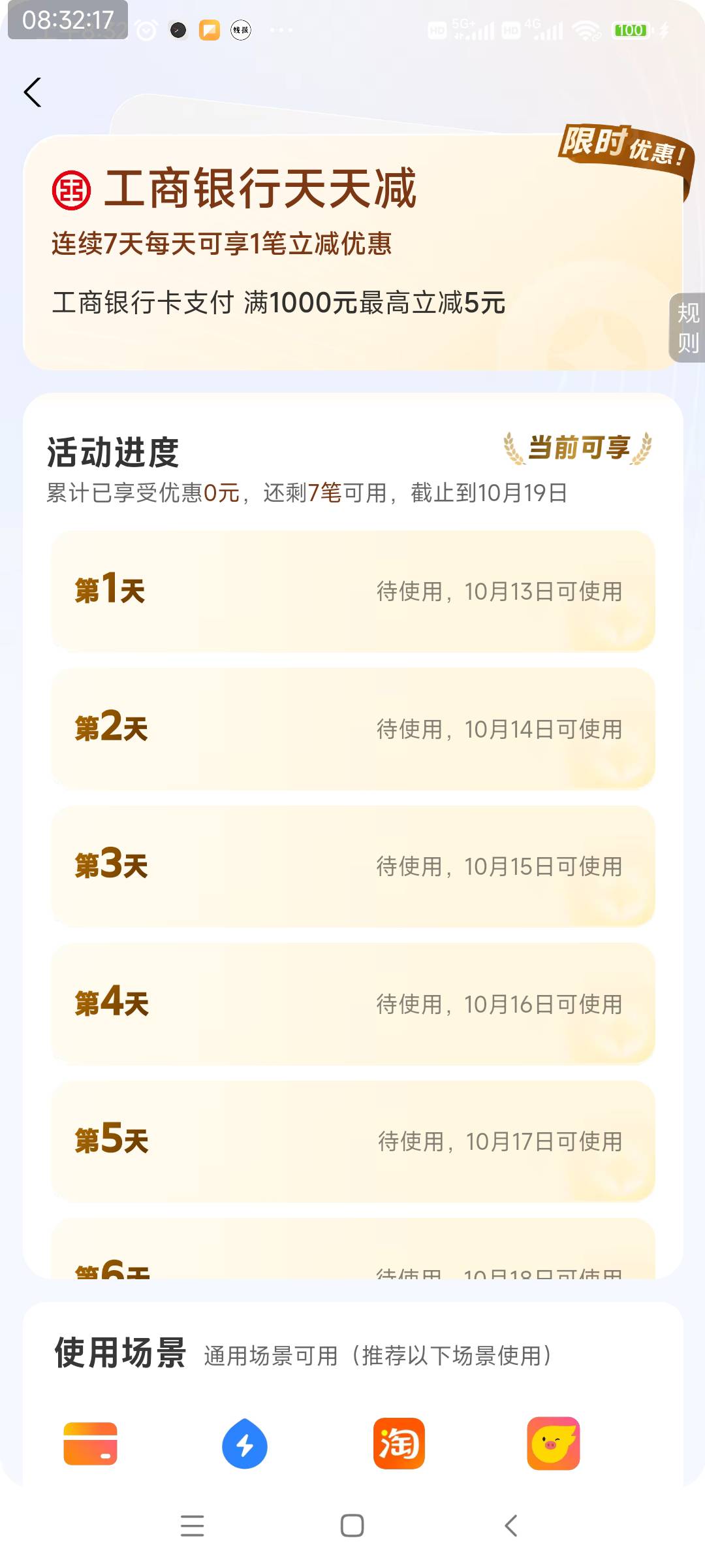 支付宝-YHK-工行天天减报名,然后收款1000-2左右,连续7天,共14块左右
