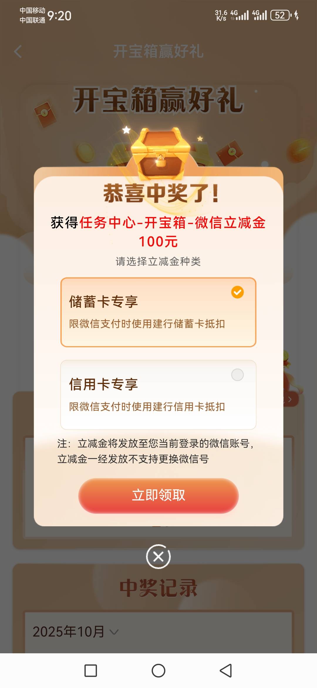 一百的话费,一百的东券都中过,就差一百立减金了