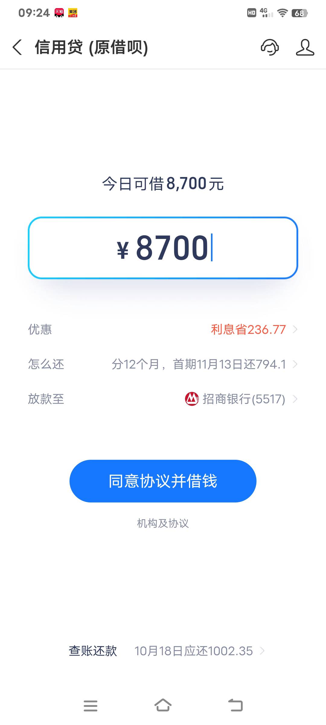 支付宝里面的借呗真好,借款都是秒到。征信呆账未处理居然给了我9700的额度,花呗2500