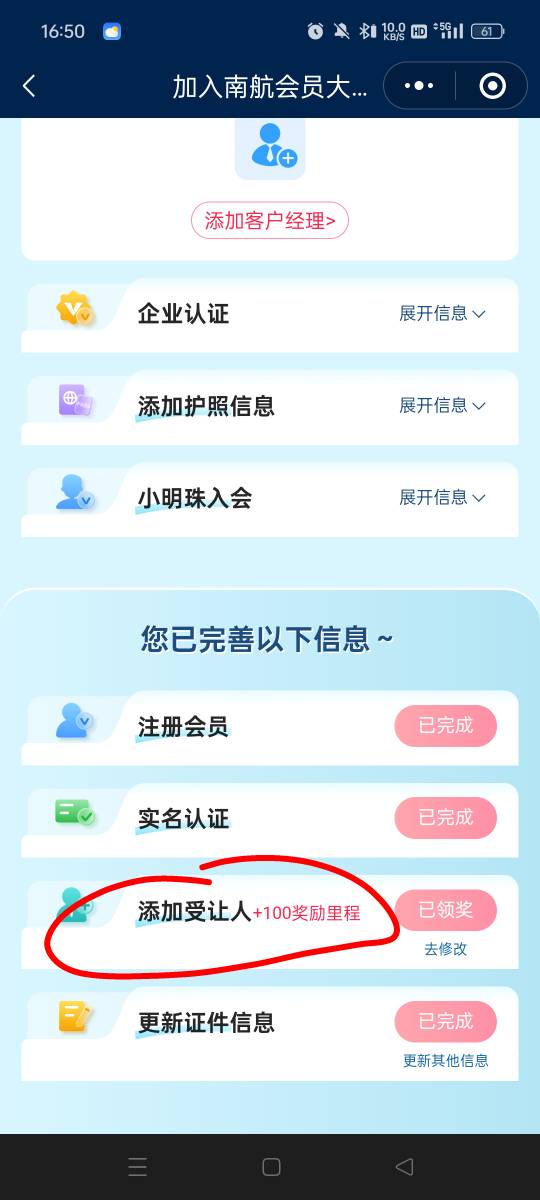 给老哥们说个小毛 南方航空有个任务添加受让人(随便填)+100 里程,然后主页横幅找到