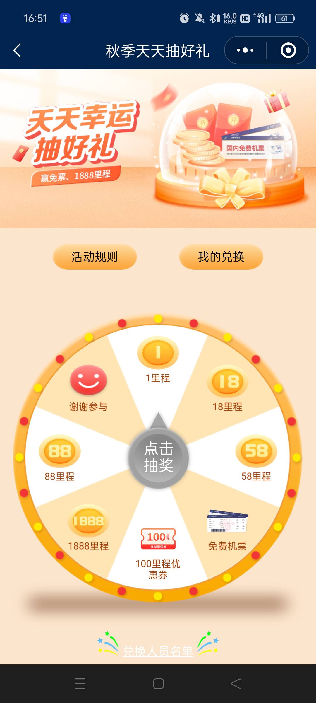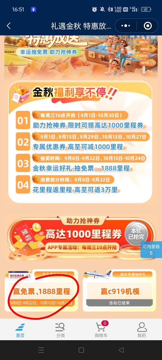 ①南航app—我—权益大提升—活动中心有个浏览活动可以获得10里程,好了返回下。②会员中心滑动横幅,找到.随心飞行橙色横幅.,进去注册下会员,这个是抽奖的,随机10-500里程,过几天会发,好了继续返回到会员中心。③点商城兑换—活动中心,进去有个抽奖活动,好了后返回到常客商城。④点搜索栏下面的权益专区,搜天猫,看了下10元天猫卡是0.5+210里程。