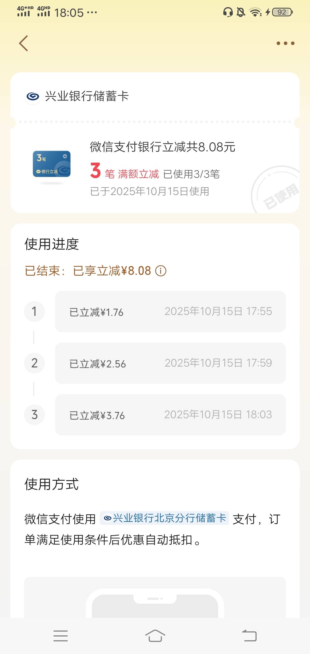 兴业北京vx有 立减优惠 3笔8毛