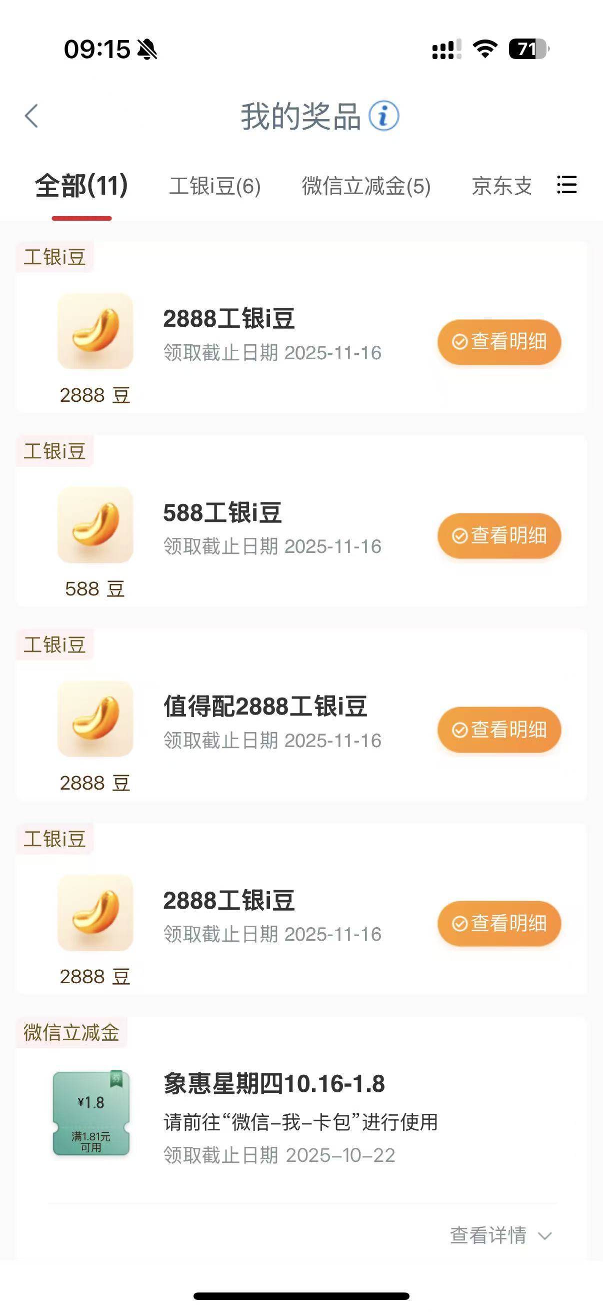 工行任务中心享活动 中了3个2888豆 一个588豆