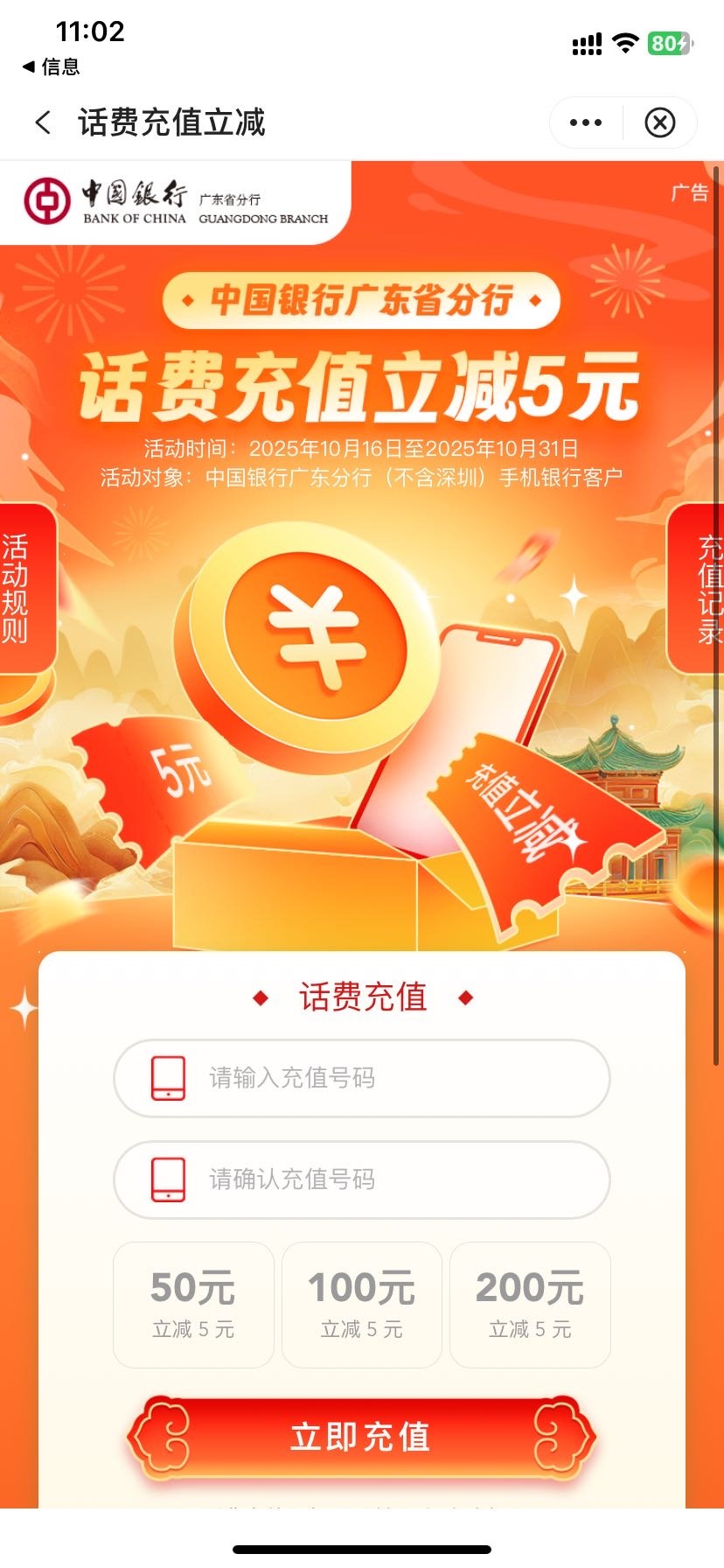 中行广东话费充值立减5元活动