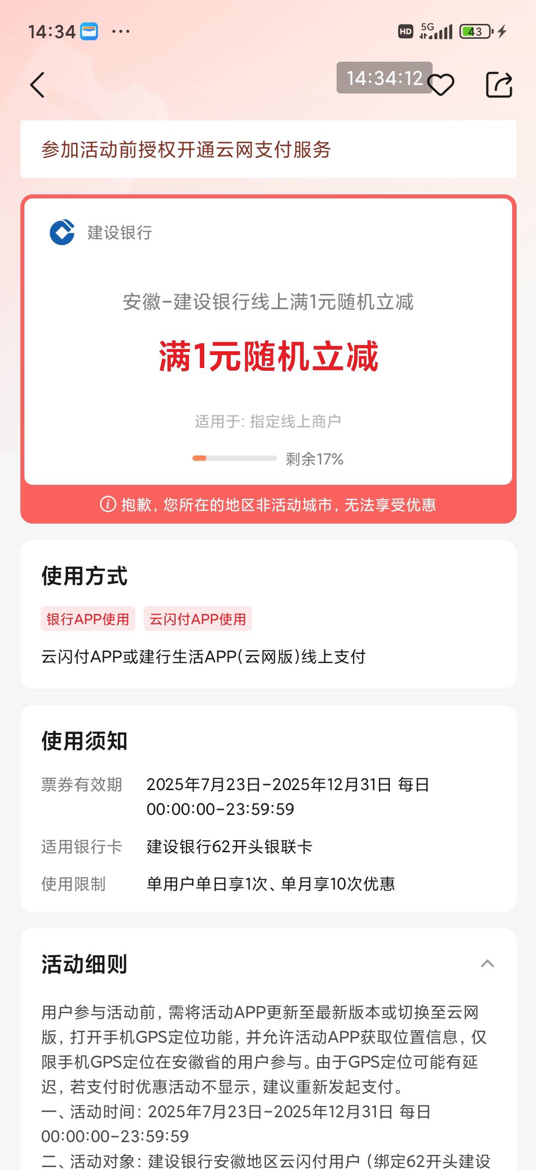 限安徽,建设银行线上满1元随机立减,美团可以用