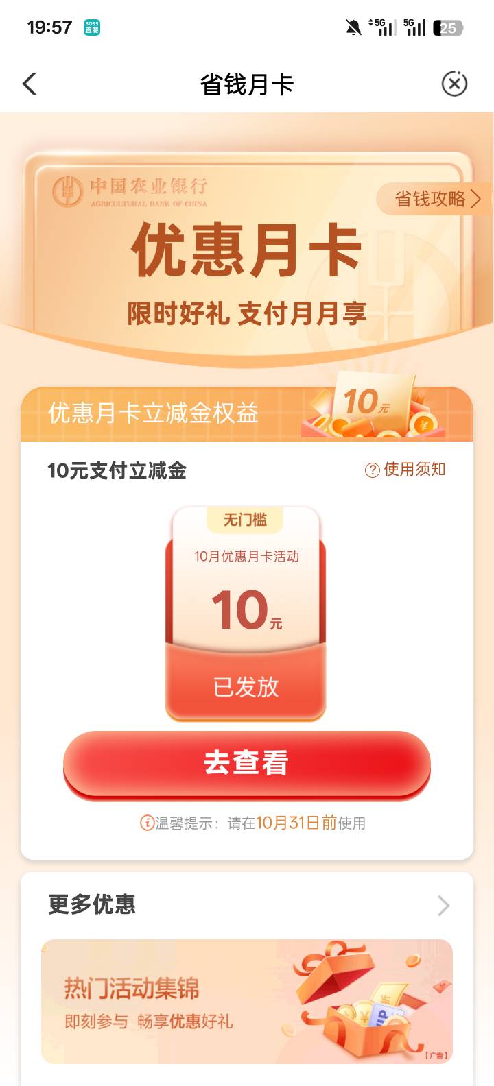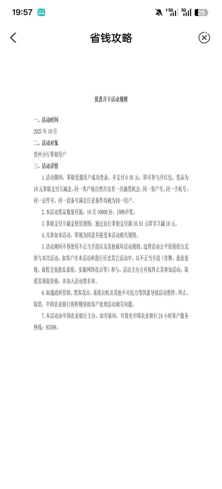 农行贵州省钱月卡限时好礼支付月月享活动