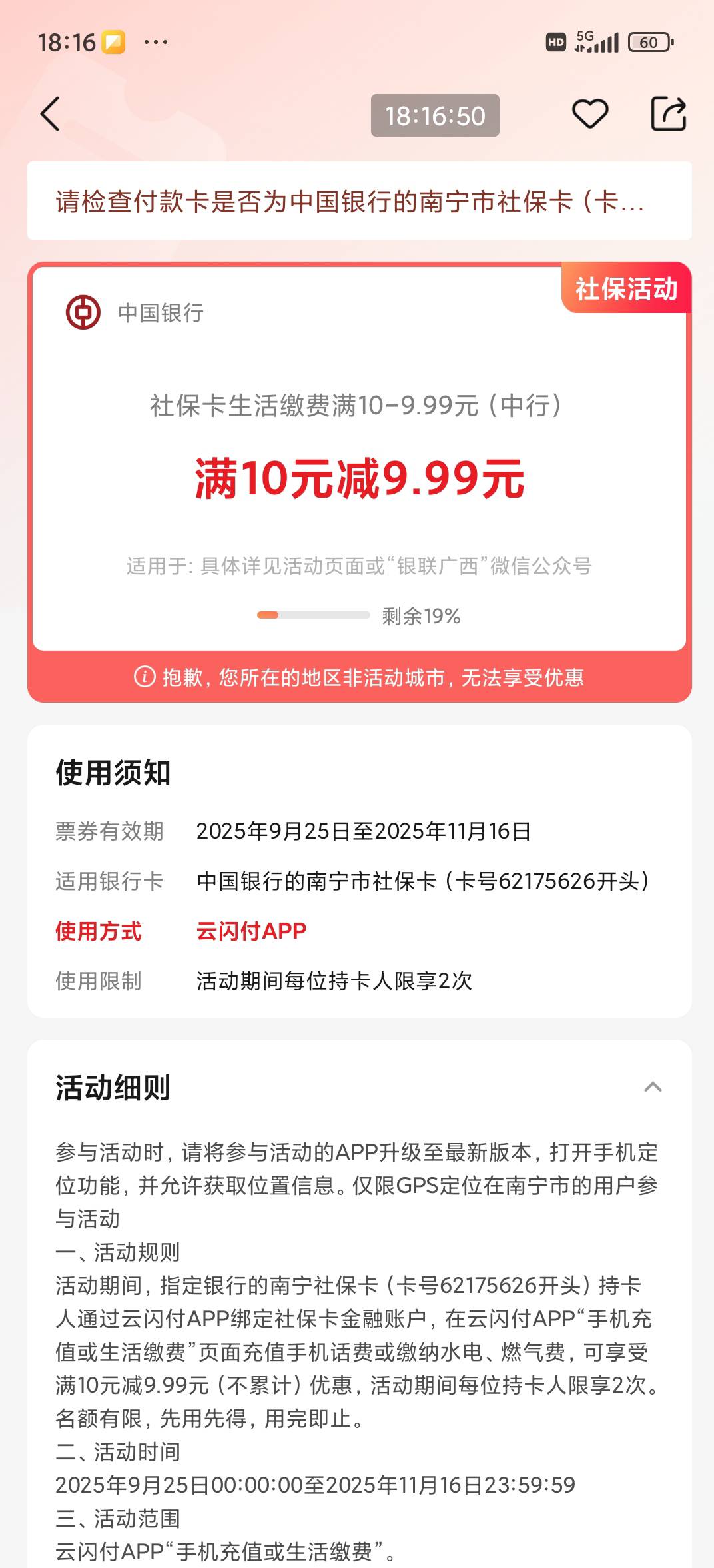 中行南宁社保卡生活缴费满10元减9.9元活动