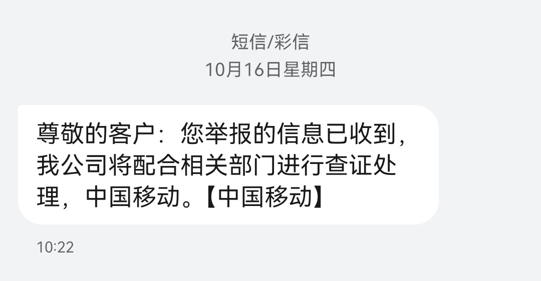 小潘7 发表于 2025-10-22 18:15 编辑短信,对方的手机号* 复制发来的信息内容,发送到10086999。搞定发多几次