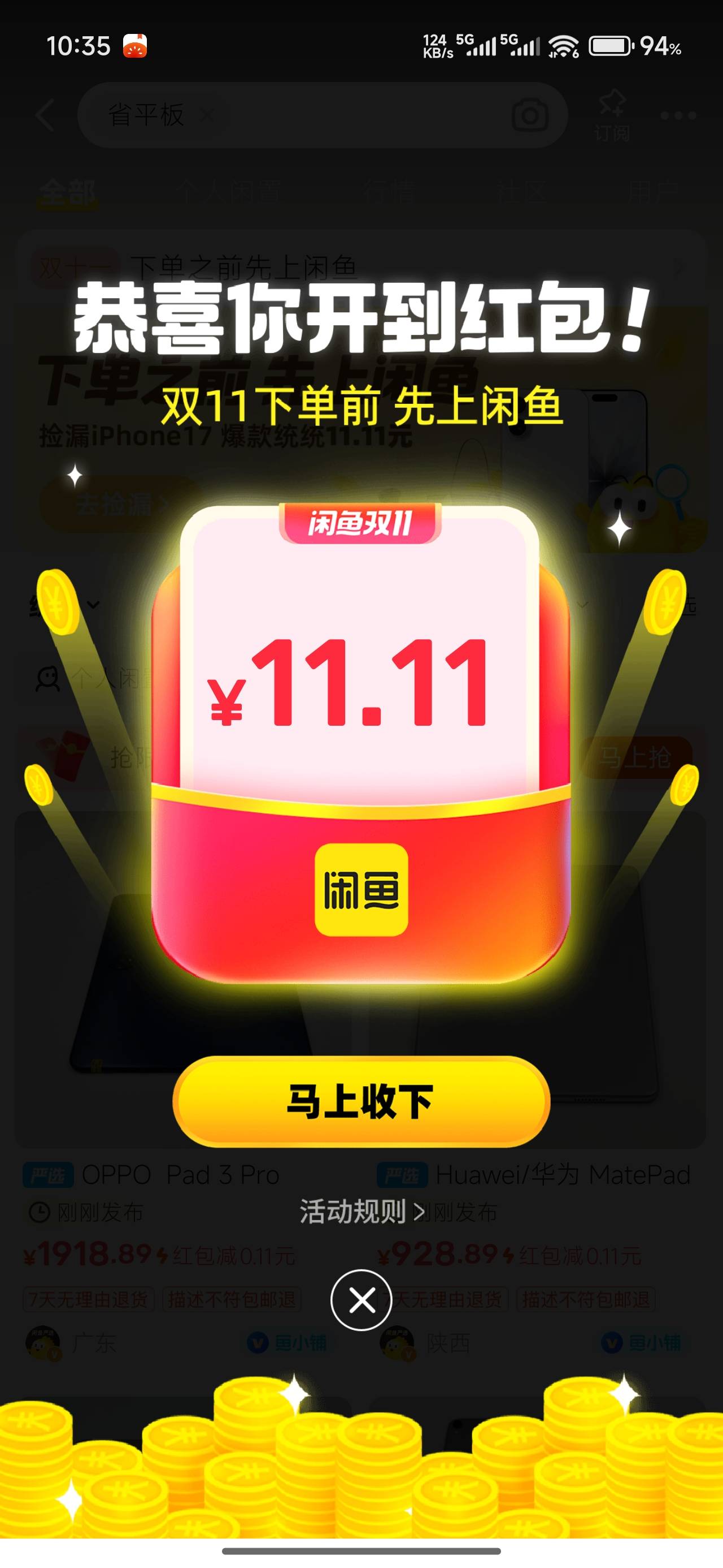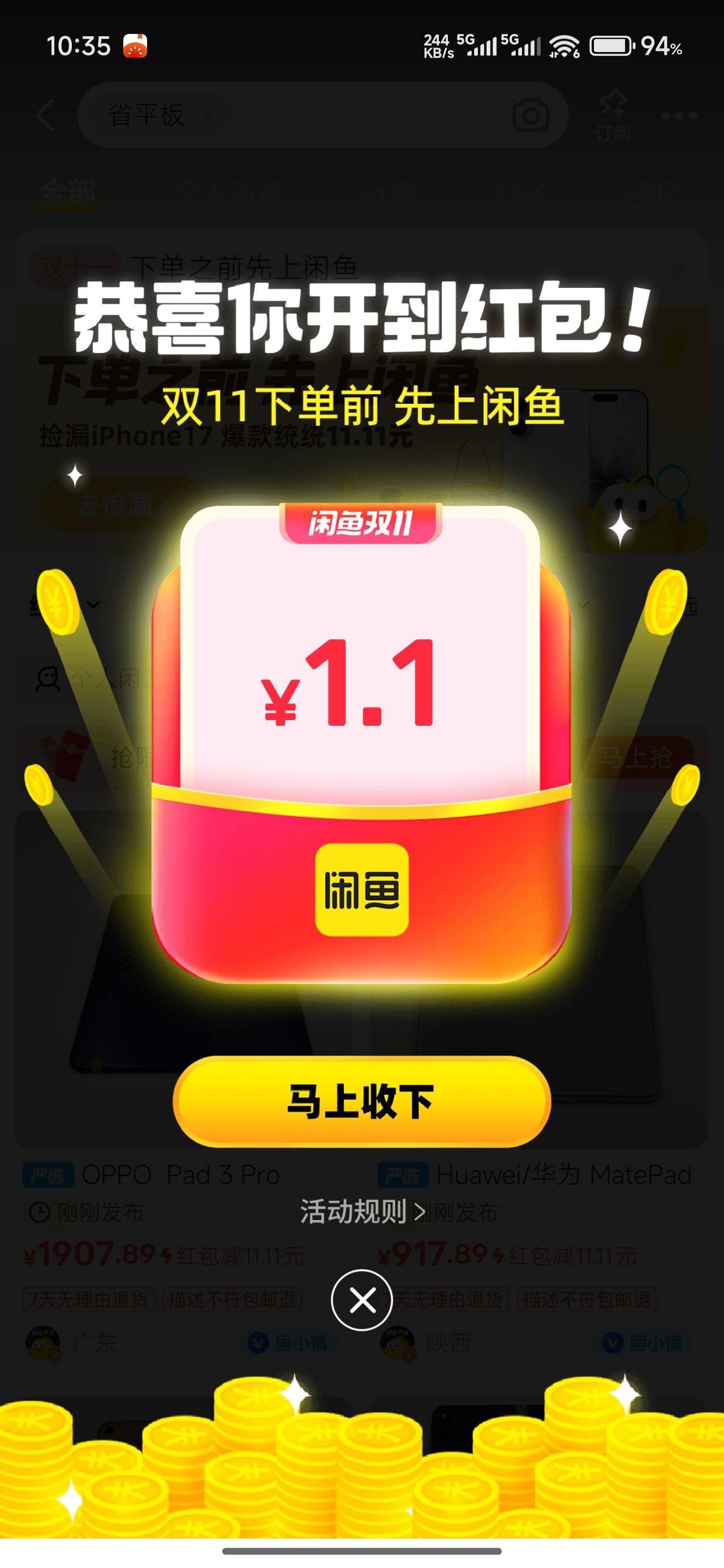 闲鱼搜索 (省平板)(神奇彩蛋) 每个搜索有5次抽奖机会  不中就退出  重新搜索 大小号上链接可以T