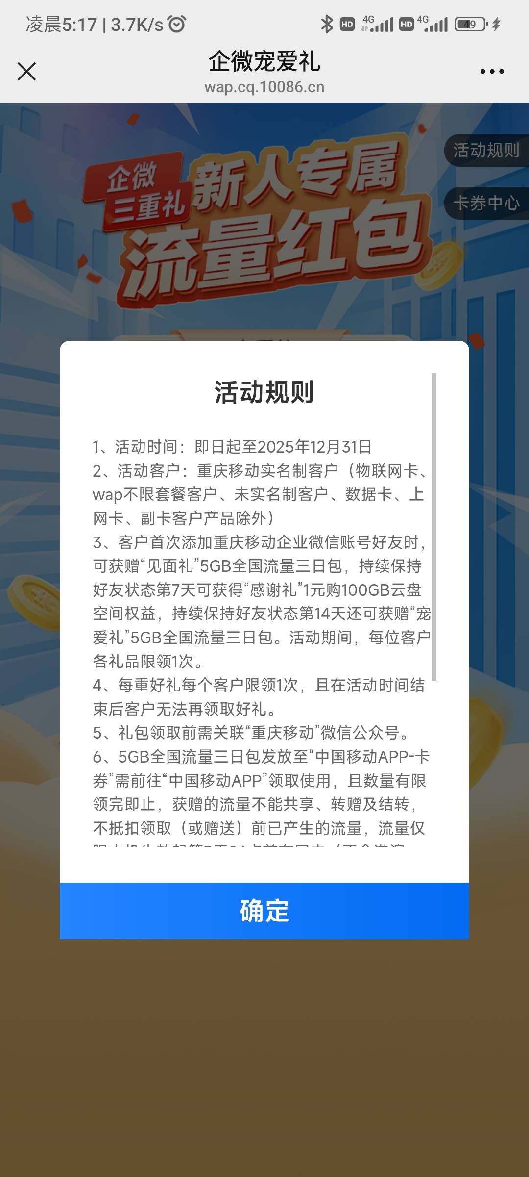 中国移动重庆企微宠爱礼新人专属流量红包活动