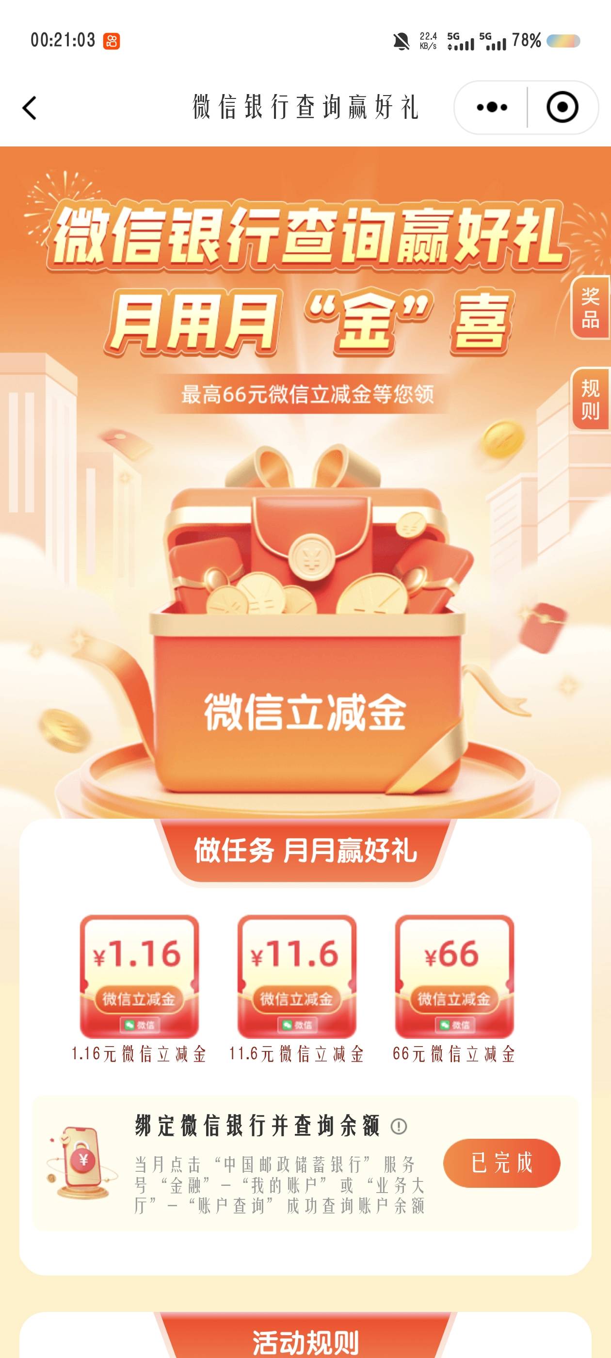 邮储银行查询赢好礼月用月金喜活动