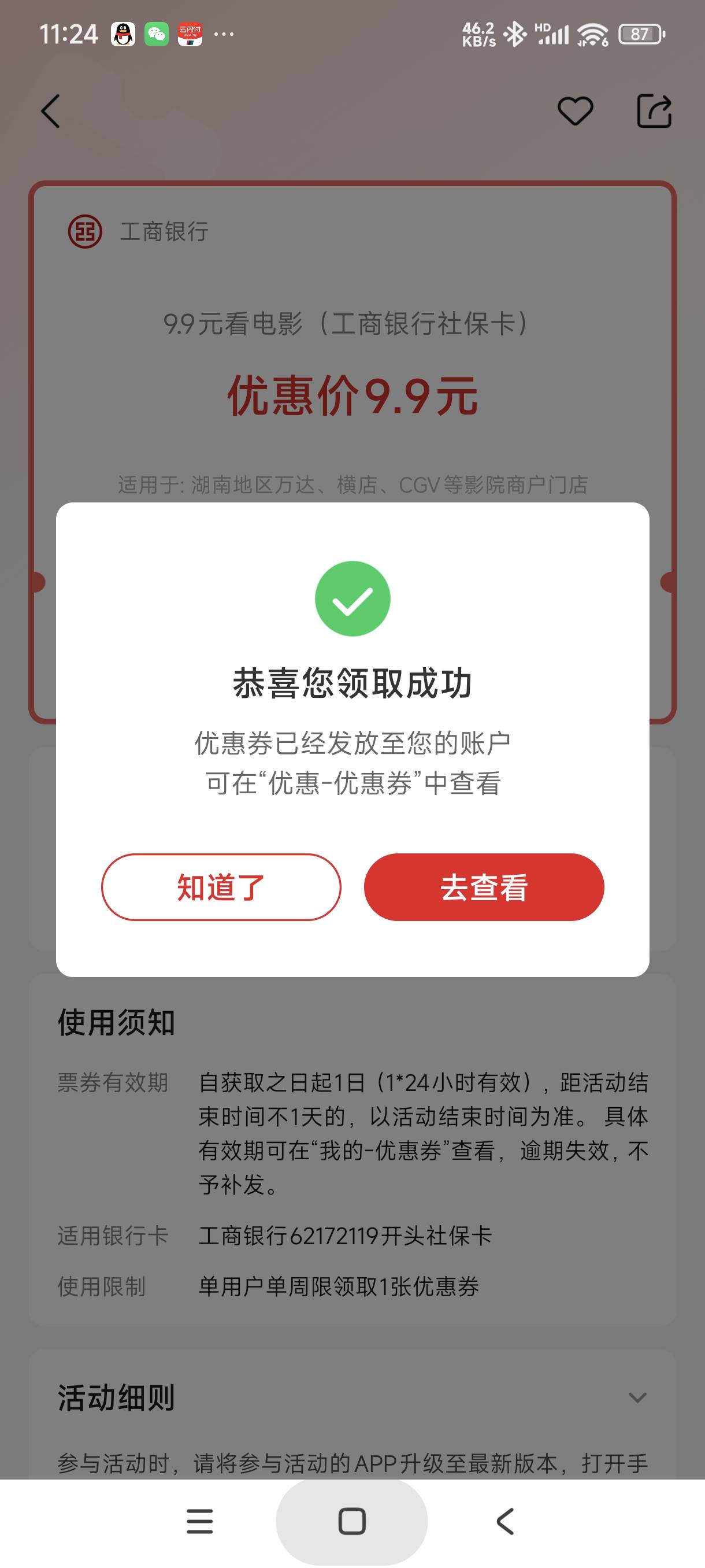 云闪付u惠湖南社保卡权益9.9元看电影活动