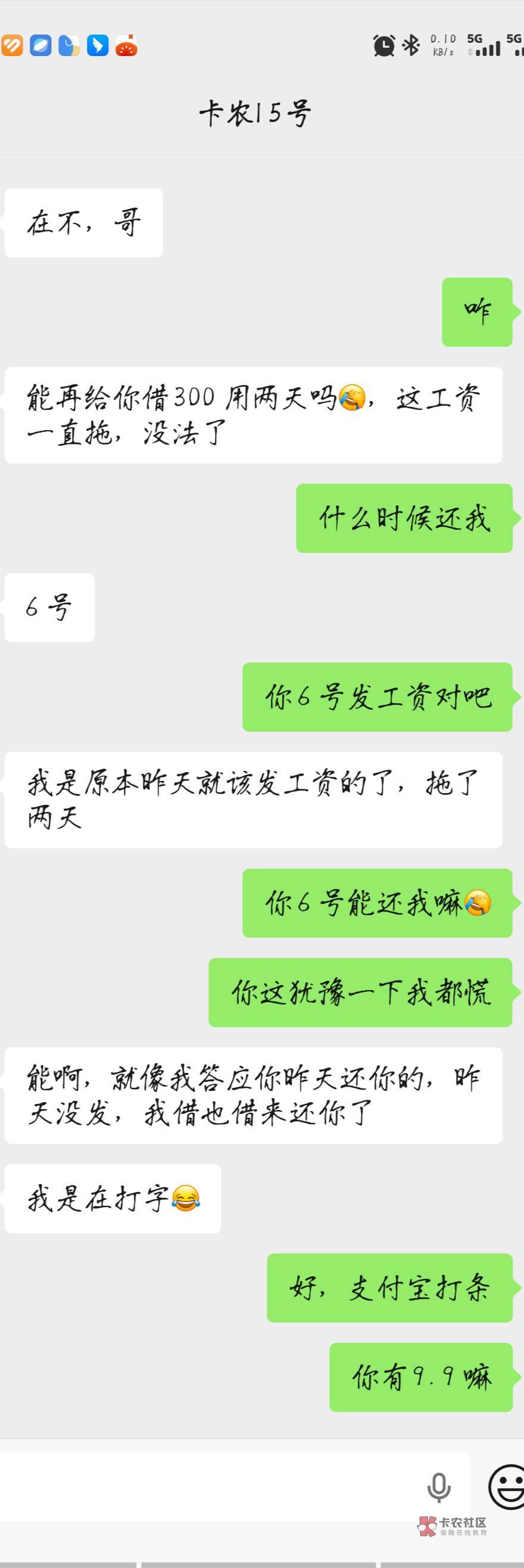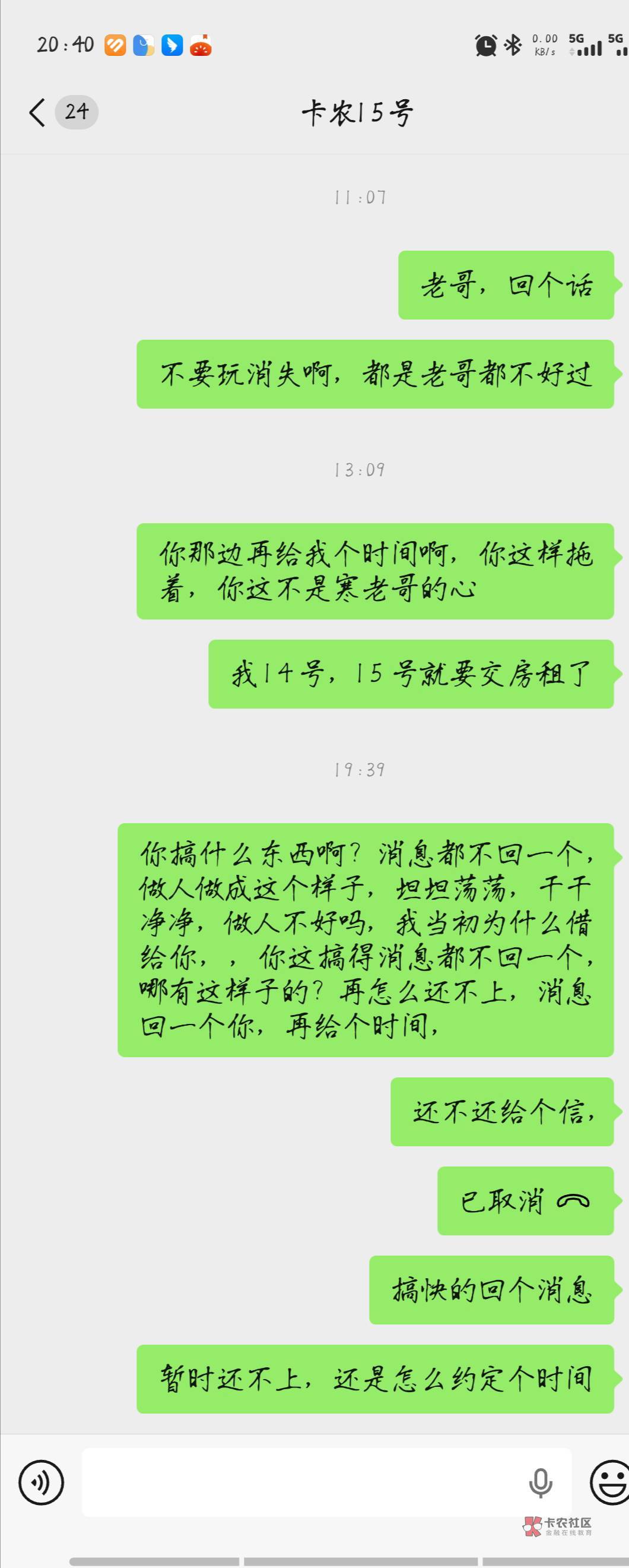 。各位老哥。任何事情都是有因有果的,结善因有善果,结恶因有恶果,你卡农都待了这么几年了,我知道你看得到,也不妨有小号。希望现在到明天早上你还是回个消息给我,重新约定个时间都行,没消息的话,我就把你艾特出来了。300块钱你能还给我最好,不能的话,我也没什么办法,对不对?,就看你是人是鬼了?