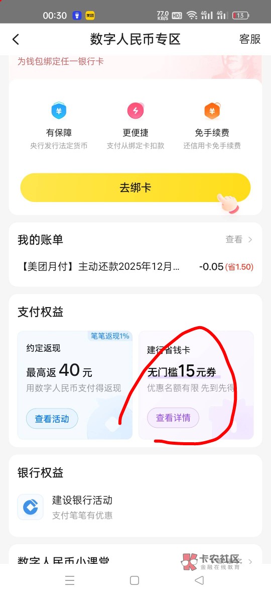 美团,数字人民币,0.01买15元建行数币券包,买团购还月付可以用,也可以用月付缴费再用这个数币还款,因为美团不支持数币直接缴费