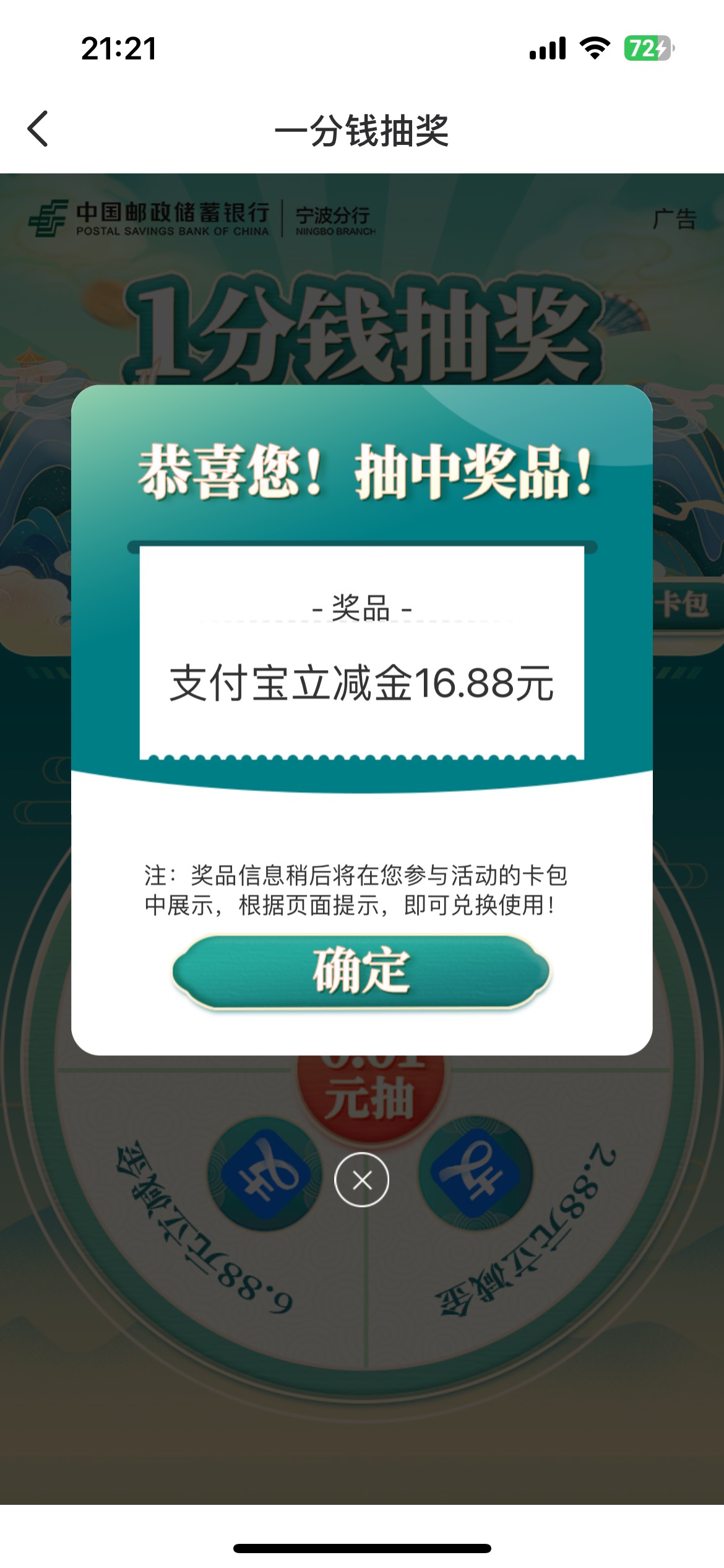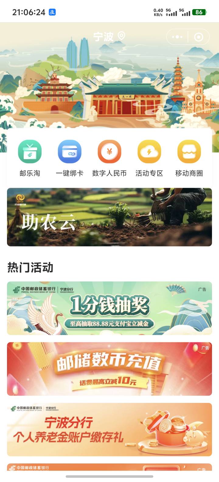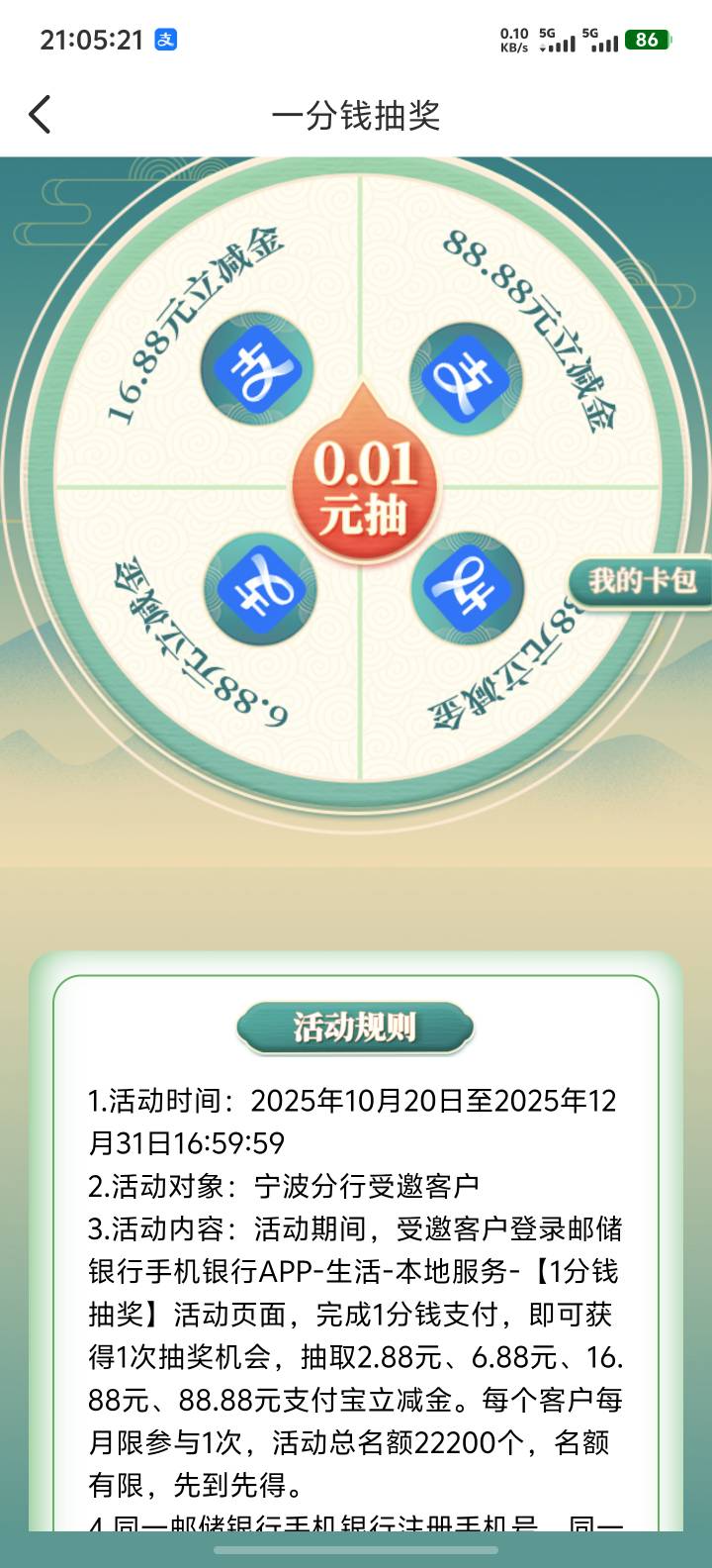 宁波邮储,,生活,本地服务,一分钱抽奖,立减金不限卡,我是有宁波养老金账户飞过来