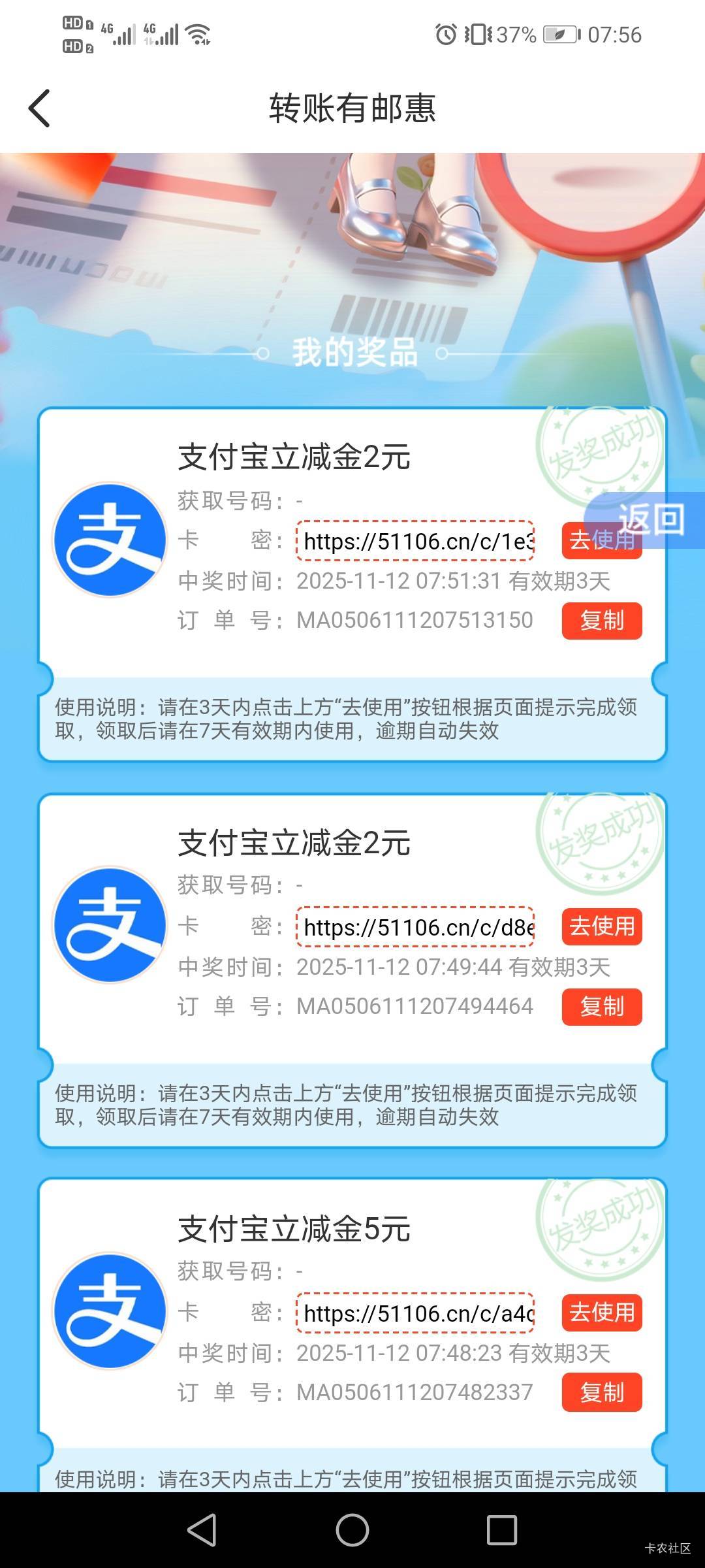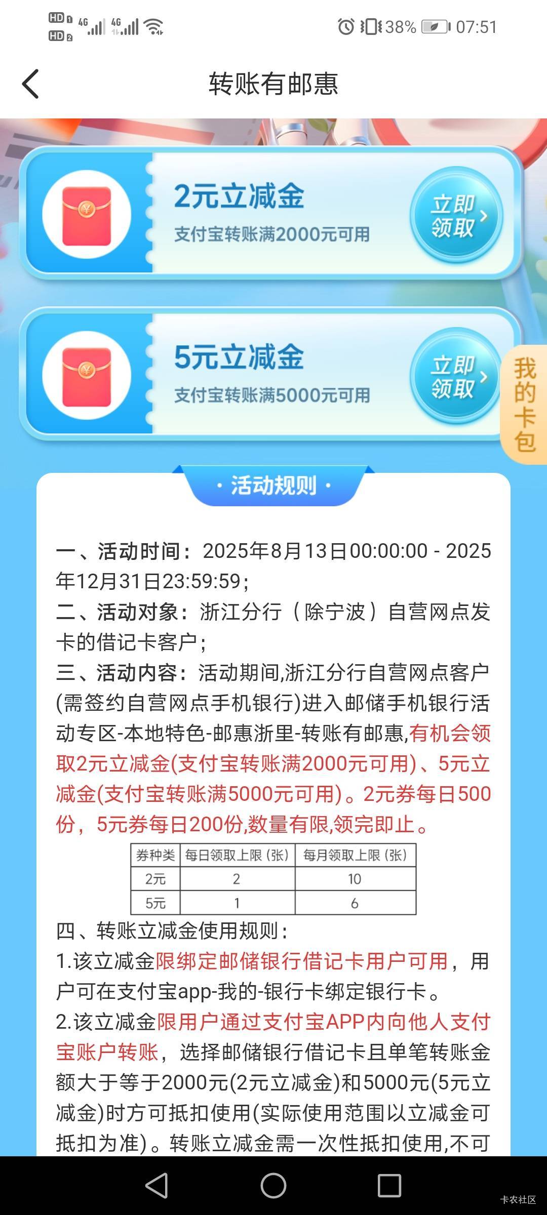 邮储浙江,活动专区本地独一无二—邮惠浙里—点下方活动,下拉找到转账有邮惠(浙江特邀专享),我是停机了几天的可以领,不知道刚飞可不可以。每天可领两千-2转账红包2张每月上限10张,五千-5转账红包每日1张,每月6张,加起来有50毛苍蝇肉,实测任意邮储卡支付宝大小号转账就行,飞浙江还有个月月邮礼可以抽次奖。
